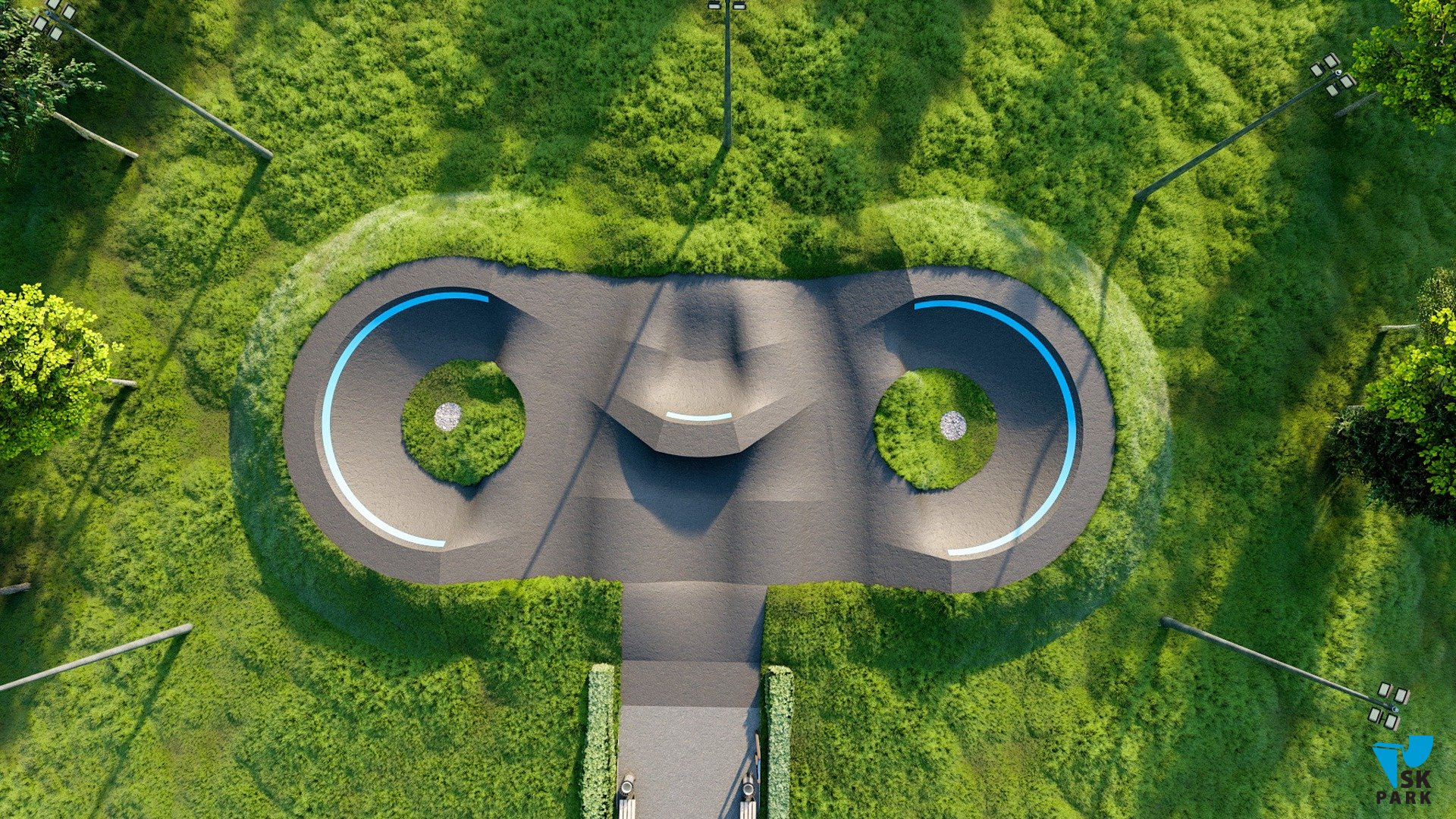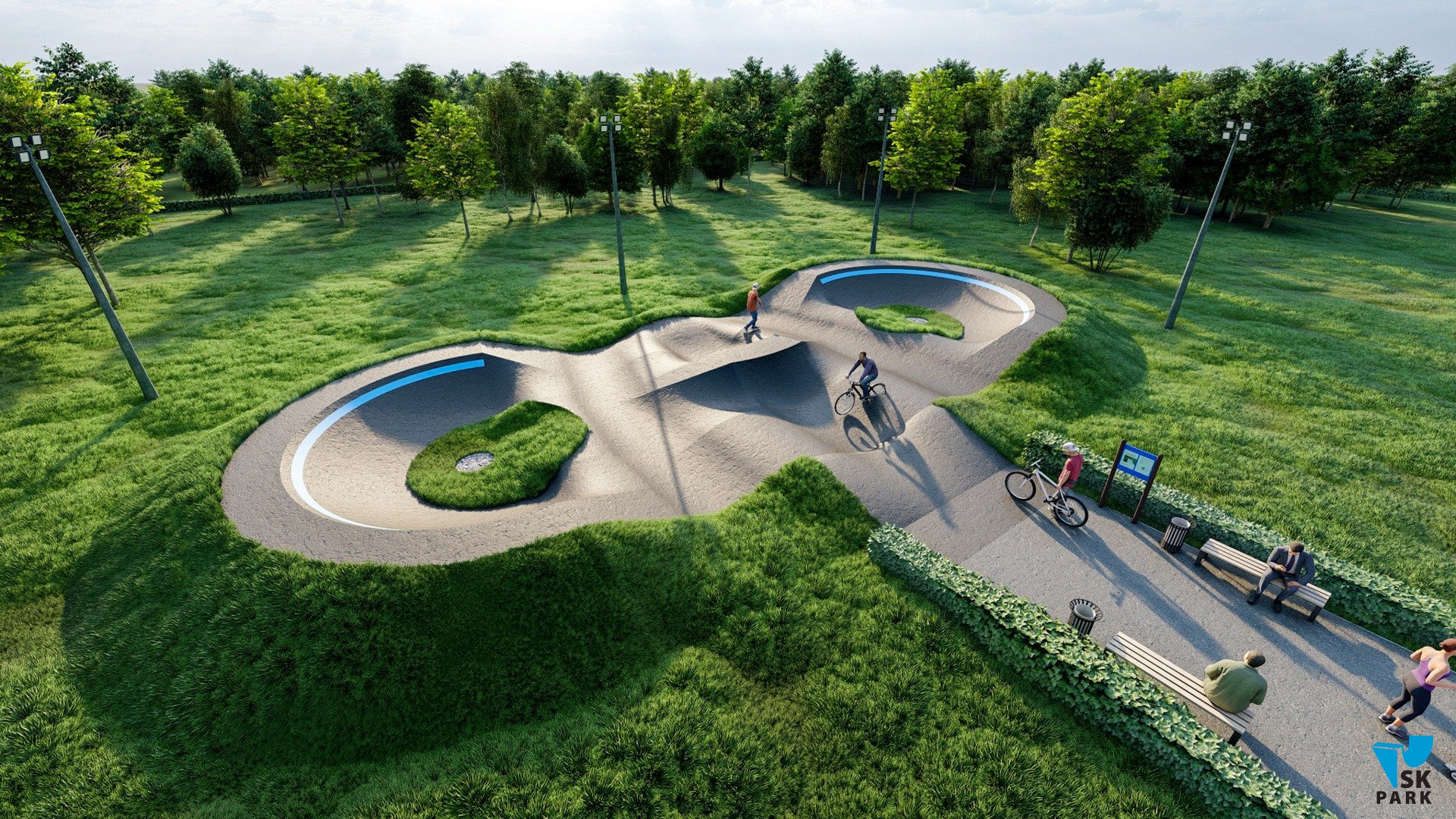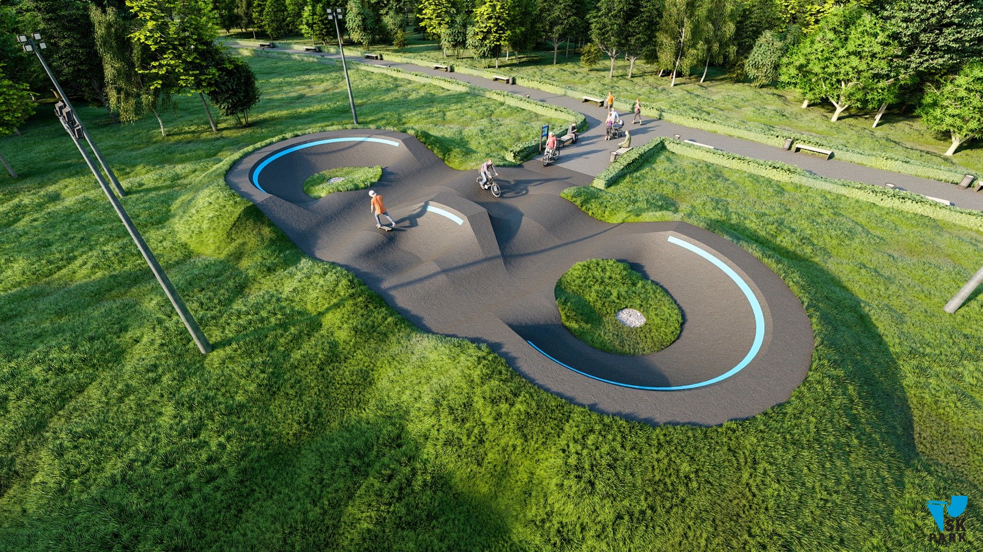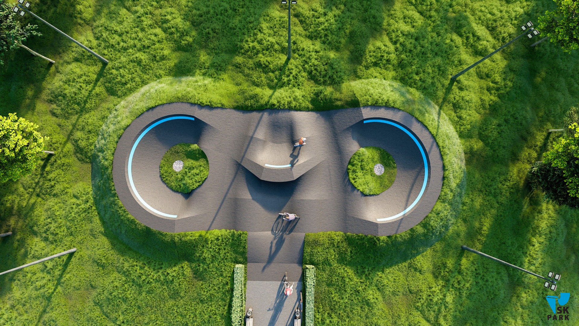Профессиональный асфальтовый памптрек для катания на BMX и MTB , для райдеров с начальным, средним и профессиональным уровнем катания. Подходит для любого уровня райдеров, а также для тренировки спортсменов в олимпийской дисциплине «BMX race». Памптрек предусматривает 2 поворота на 195 градусов и 1 поворот на 30 градусов. Трасса позволяет проводить соревнования и показательные выступления в олимпийской дисциплине «BMX RACE». Асфальтовый памп трек, также позволяет кататься в дисциплинах скейтбординг, ролики, кик скутер