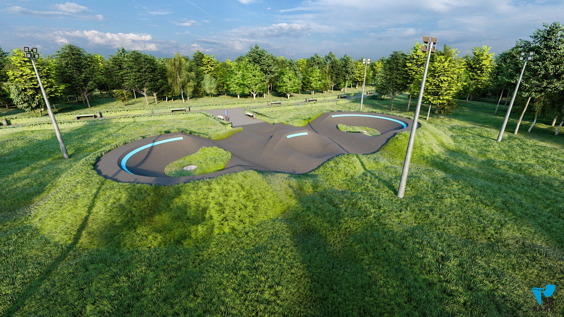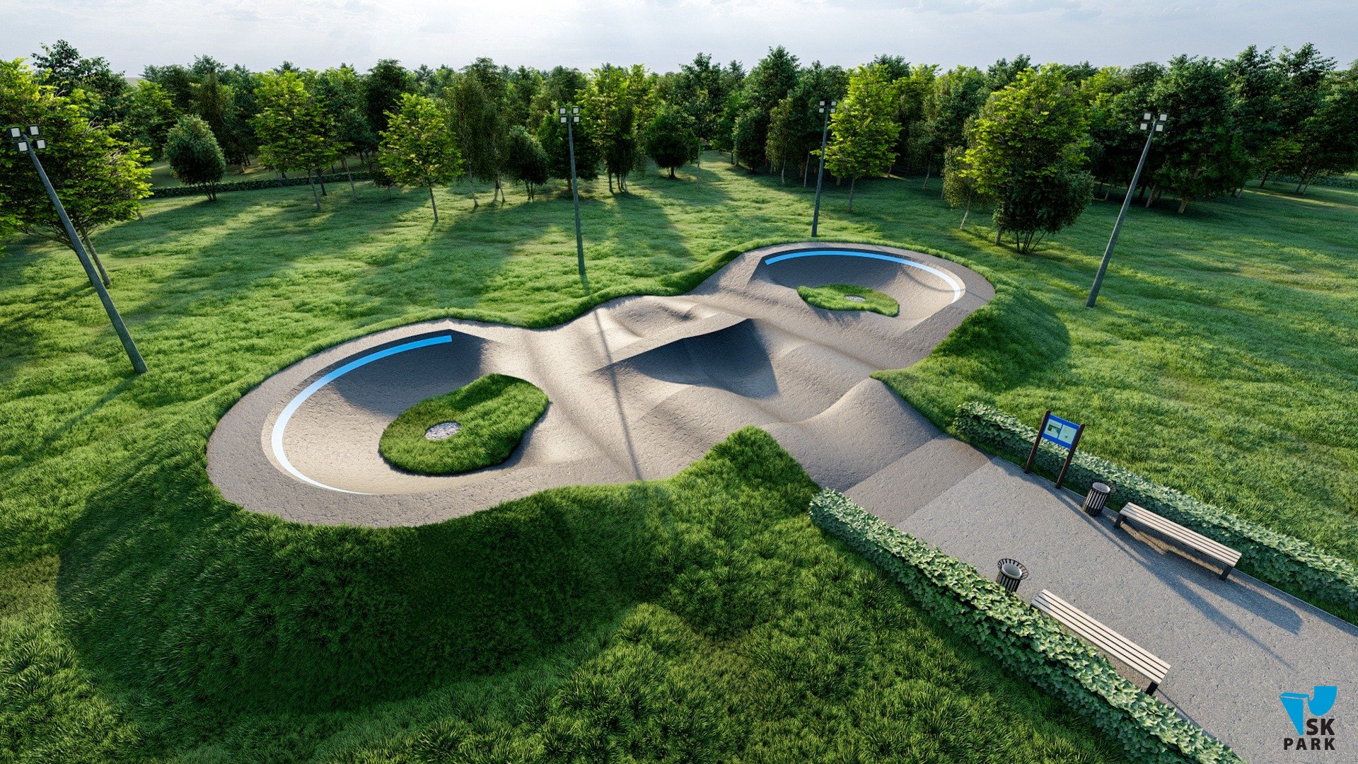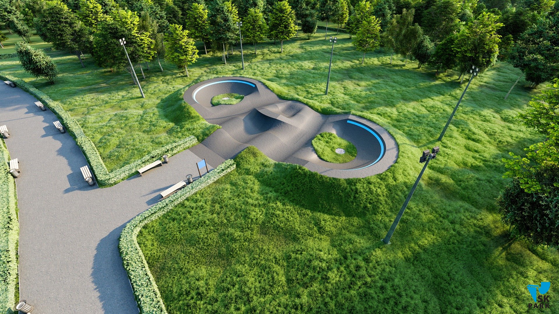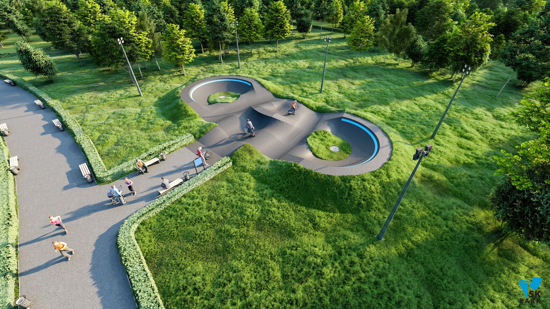 Профессиональный асфальтовый памптрек для катания на BMX и MTB , для райдеров с начальным, средним и профессиональным уровнем катания. Подходит для любого уровня райдеров, а также для тренировки спортсменов в олимпийской дисциплине «BMX race». Памптрек предусматривает 2 поворота на 195 градусов и 1 поворот на 30 градусов. Трасса позволяет проводить соревнования и показательные выступления в олимпийской дисциплине «BMX RACE». Асфальтовый памп трек, также позволяет кататься в дисциплинах скейтбординг, ролики, кик скутер