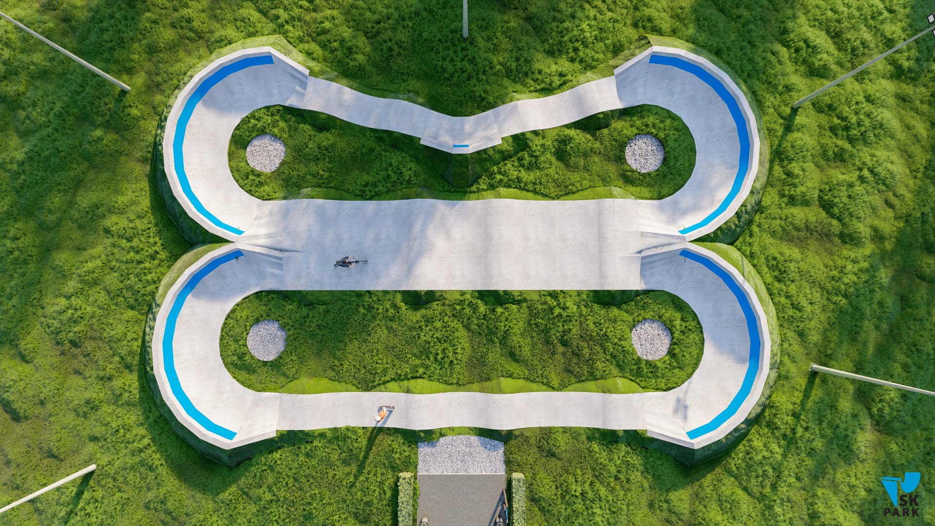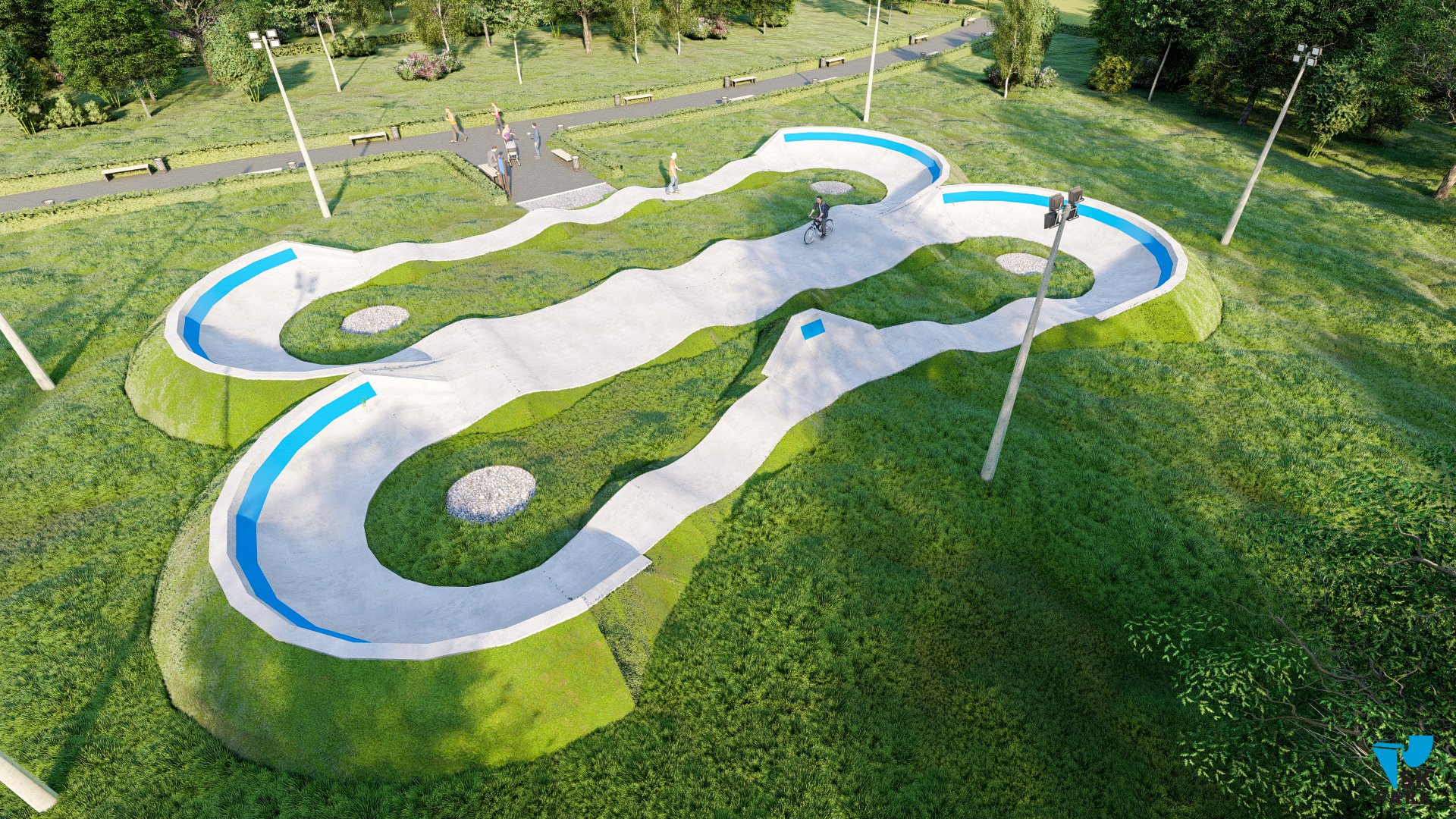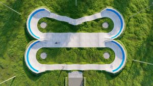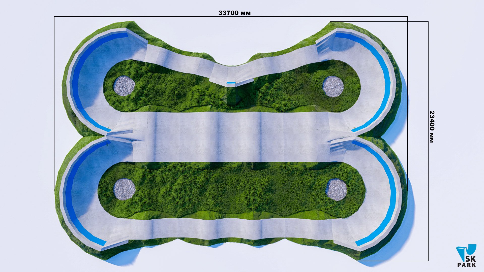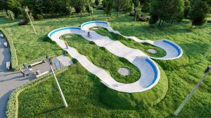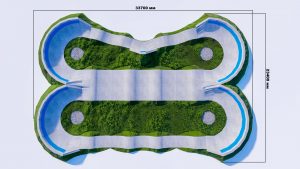 Профессиональный бетонный памптрек совмещающий в себе две трассы длиной 55 метров и 52 метра. Подходит для любого уровня райдеров, а также для тренировки спортсменов в олимпийской дисциплине «BMX race». Памптрек предусматривает 2 поворота на 180 градусов, 2 поворота на 165 градусов и 1 поворот на 135 градусов. Подходит для проведения соревнований, показательных выступлений и памп-батлов. Отличное решение для установки на территории спортивных школ, стадионов, а также для любых других объектов обладающих подходящей площадью.