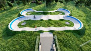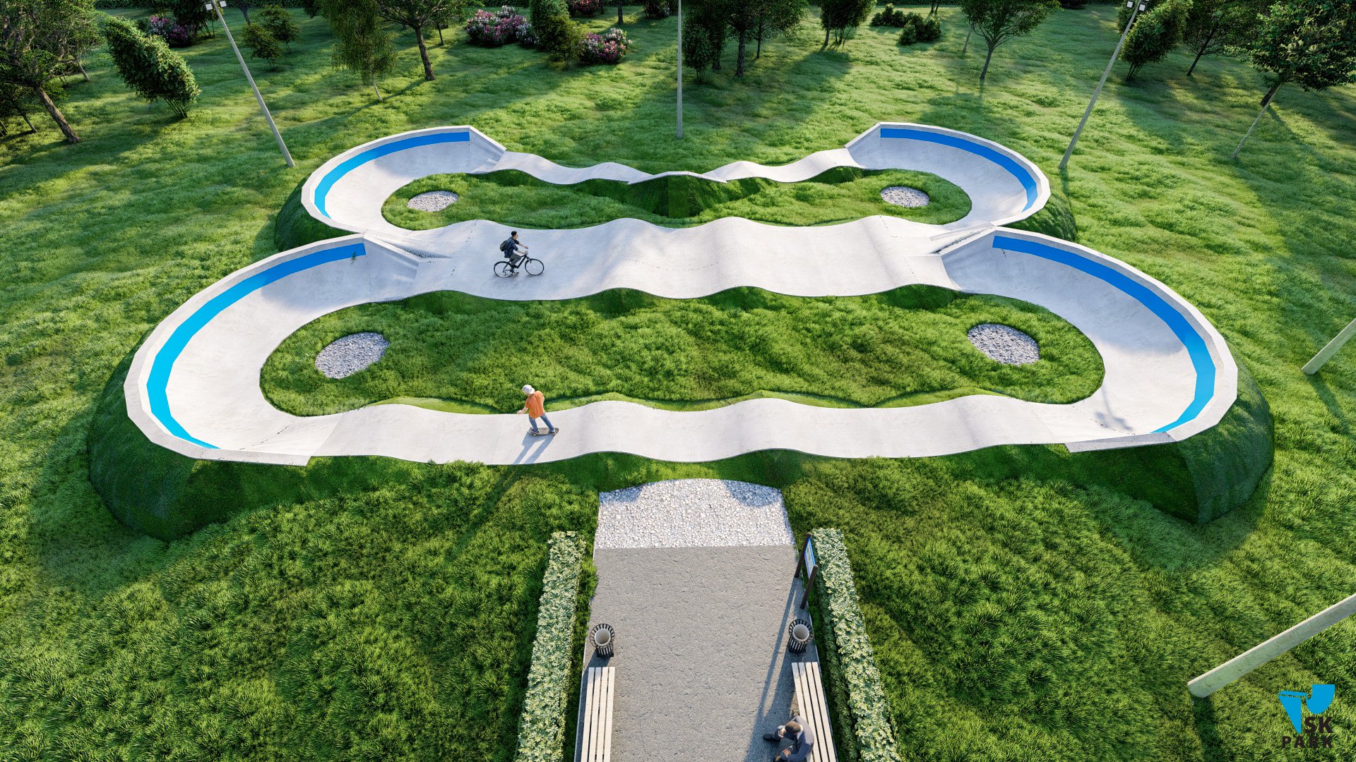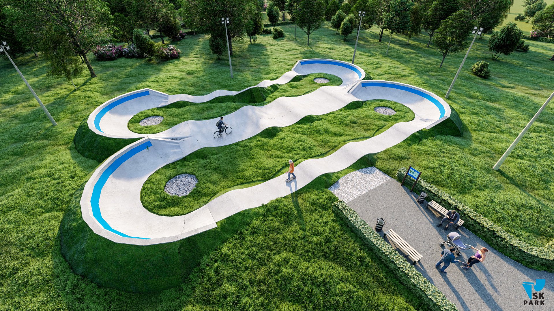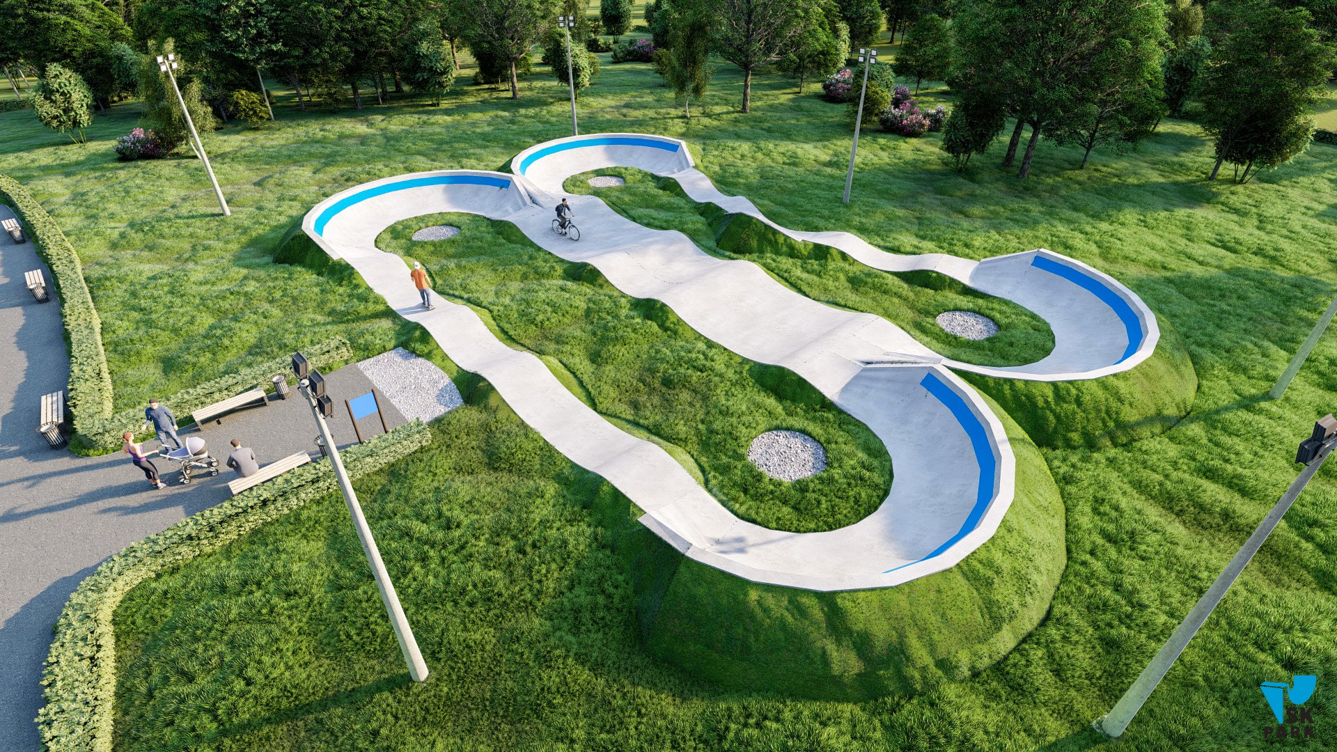 Профессиональный бетонный памптрек совмещающий в себе две трассы длиной 55 метров и 52 метра. Подходит для любого уровня райдеров, а также для тренировки спортсменов в олимпийской дисциплине «BMX race». Памптрек предусматривает 2 поворота на 180 градусов, 2 поворота на 165 градусов и 1 поворот на 135 градусов. Подходит для проведения соревнований, показательных выступлений и памп-батлов. Отличное решение для установки на территории спортивных школ, стадионов, а также для любых других объектов обладающих подходящей площадью.