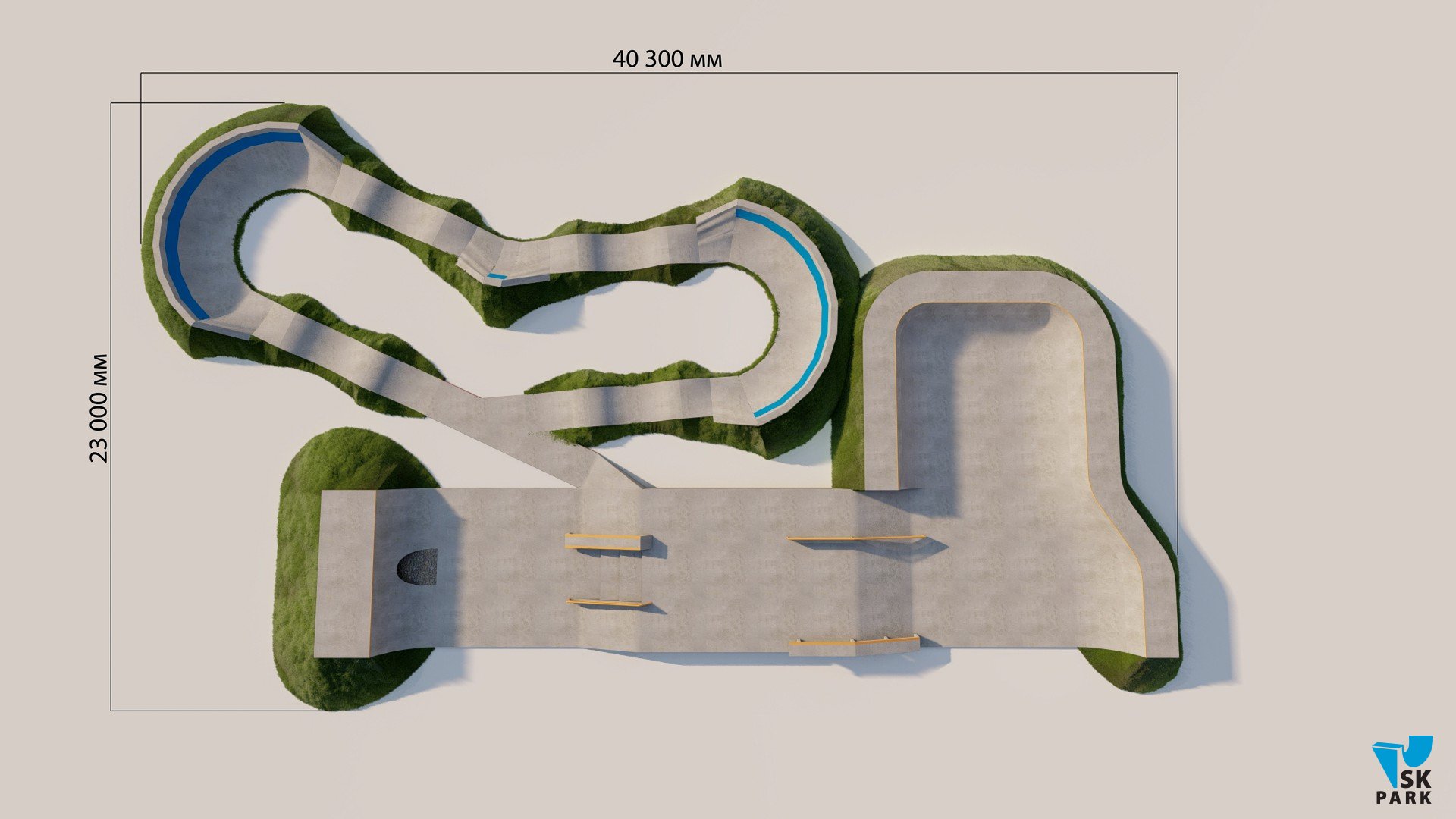 Данный проект бетонного скейт парка ориентирован для тренировок в олимпийской дисциплине «скейтборд стрит» и ориентирован на райдеров с начинающим и средним уровнем катания. Также скейт-парк подходит для катания роликах и кик скутере.
