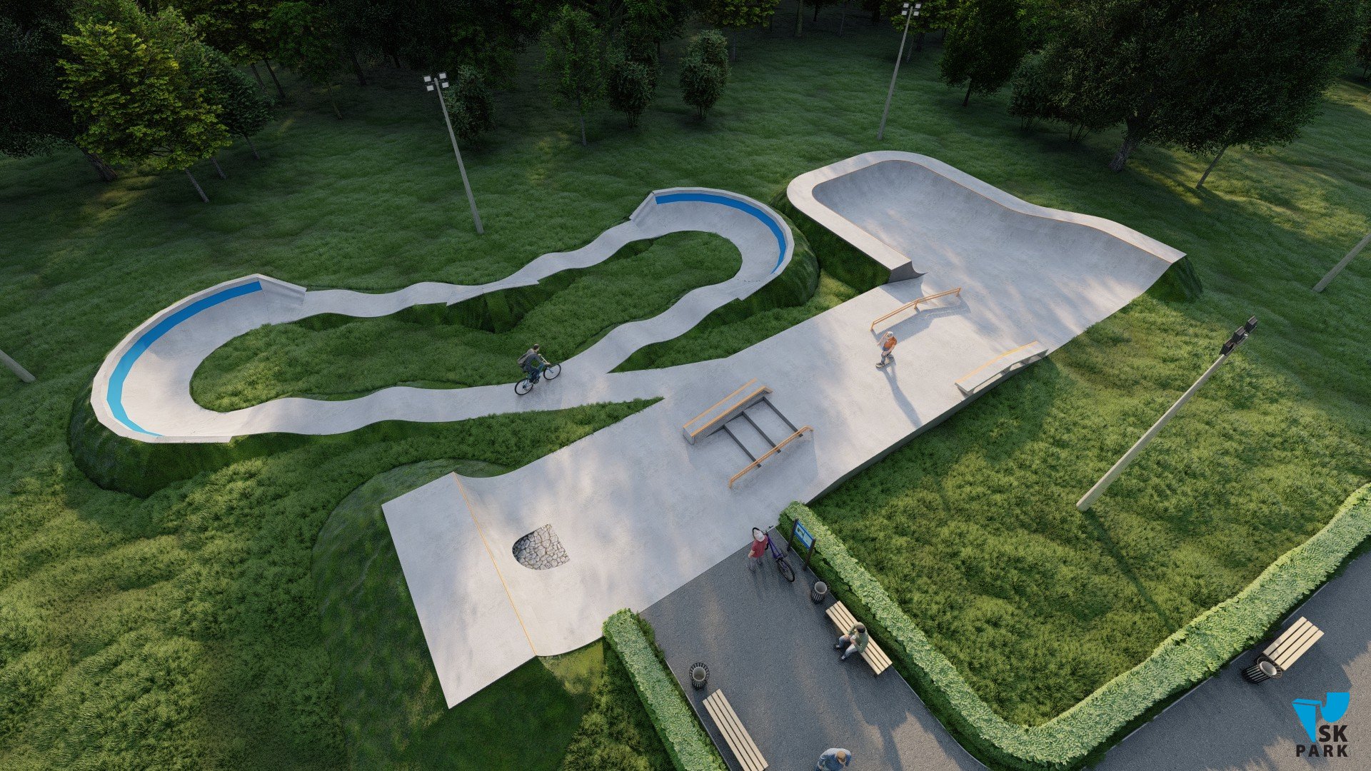 Для тренировок вкатывания в горки, повороты и кочки, в проекте предусмотрен бетонный памптрек, соединенный со скейтплазой, длинною 44 метра с тремя поворотами под разными углами. Памптрек является прекрасным тренажером для райдеров всех дисциплин.