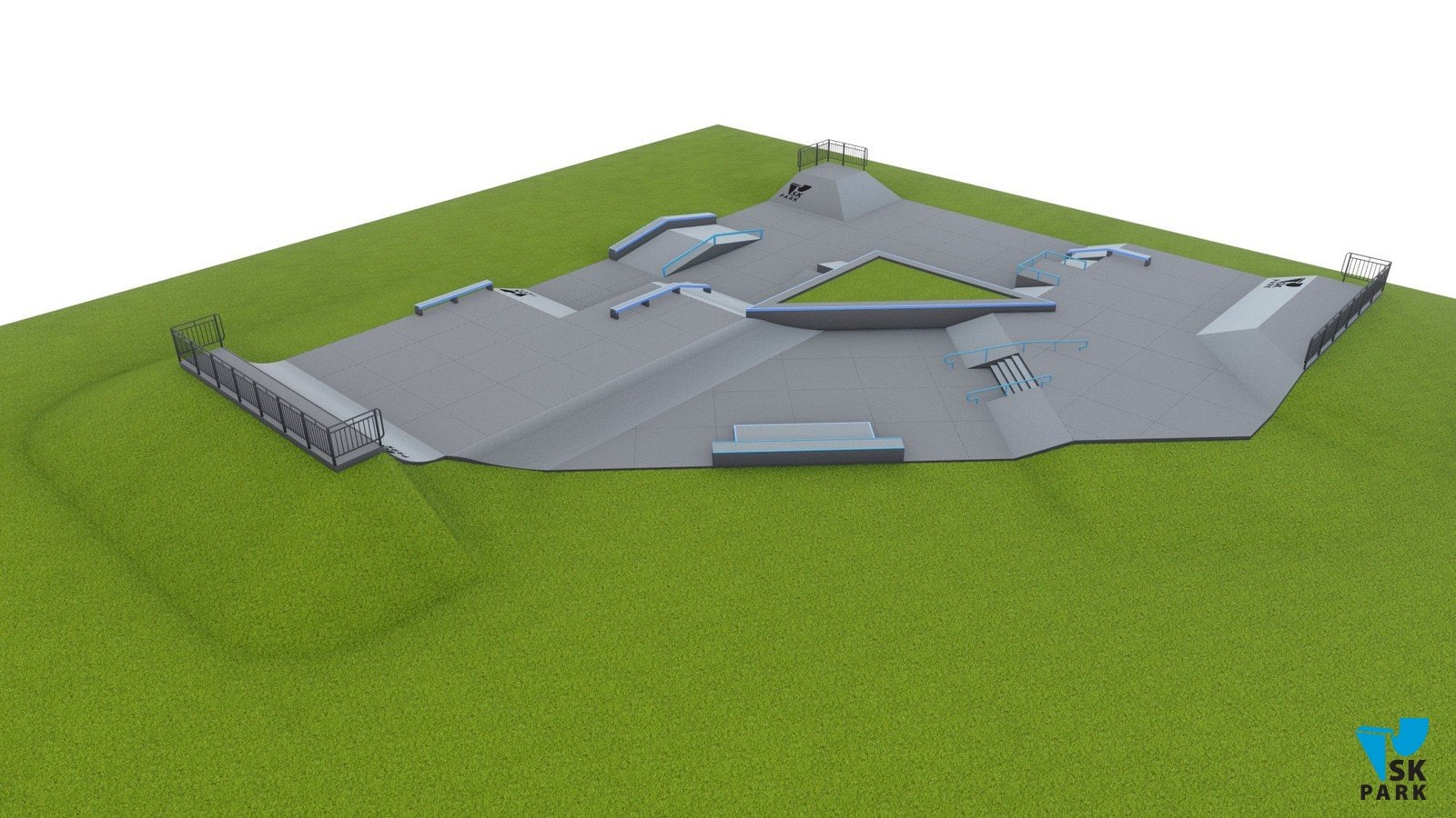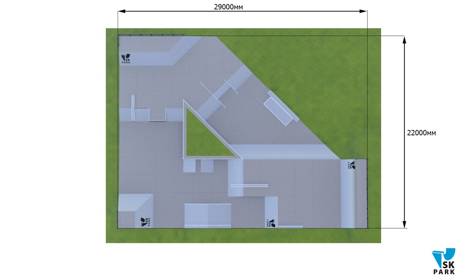 Скейт площадка спроектирована таким образом, что райдеры могут выполнять трюки, двигаясь по скейтпарку без остановки. Разнообразие фигур подходит практически для всех видов трюков. Основными конструкциями скейт-парка являются две плазы. Первая плаза включает в себя: квотерпайп для разгона, прыжковых трюков и скольжений по коупингу, бэнки для вылетов из них, прыжков в них, и на пол, а также «трансферные» прыжки из одного бэнка в другой, прямой граиндбокс для более простых скольжений, кинковый граиндбокс для более сложных скольжений. Вторая плаза содержит: разгоночную пирамиду (можно использовать как бэнк или хип), кинковый граиндбокс для скольжений, кинковый и наклонный рейл, сет из пяти ступеней, площадку с забором, которую можно перепрыгивать или скользить по нему. Между плазами на одной из линии находится комбинация граиндбокса и мэнуал пада, а на другой линии находится А-бокс с симметричными наклонными граиндбоксом и рейлом и два кикера, стоящие на небольшом расстоянии для отработки амплитуды прыжковых трюков. В третьем углу площадки располагается угловая пирамида, которая полезна при разгоне и для трюков с вращениями, выполняемыми из одной ее плоскости в другую. По середине всей площадки находится треугольный граиндбокс, который можно использовать как отдельно, так и с использованием рядом стоящих кикеров, скейтплаз.