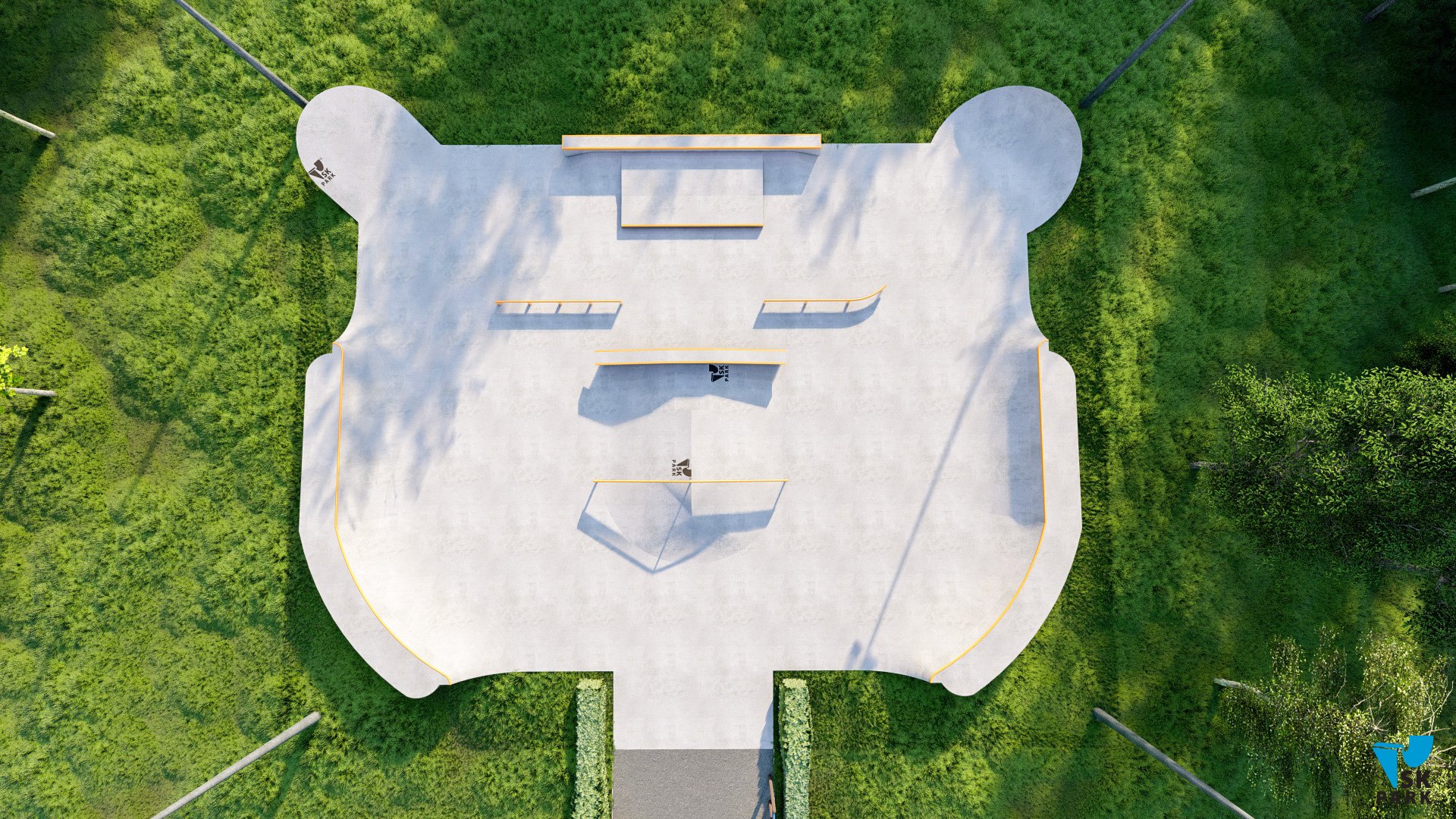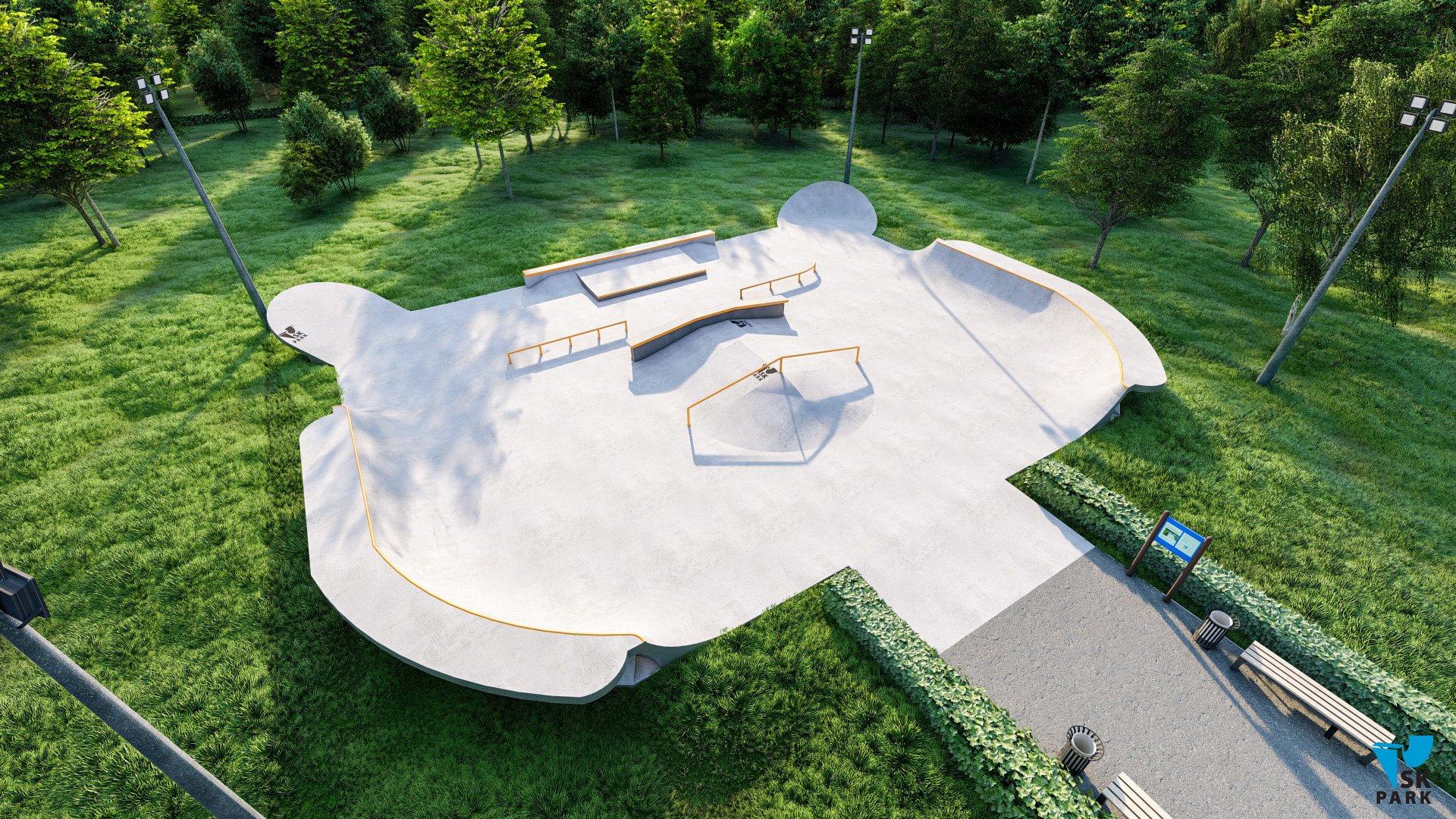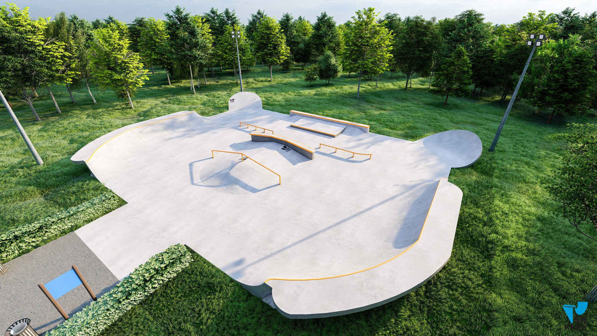 Небольшая скейт площадка спроектирована таким образом, что на ней могут тренироваться райдеры начинающего и среднего уровня. Разнообразие фигур подходит практически для всех видов трюков на скейтборде. В проекте предусмотрен универсальный фанбокс-книжка с пирамидой, перилами и грайндбоксом, на котором могут тренироваться как начинающие, так и профессиональные райдеры. Грайнбокс с мэнуалпэдом, оснащенные подкатом ориентированы на креативные тренировки навыков катания во всех заявленных дисциплинах. Высоты перил и граней подходят райдерам всех дисциплин(скейтбординг, ролики, кик скутер) и возрастов. Для тренировок базовых трюков по скольжениям, в проекте предусмотрены флэт перила.