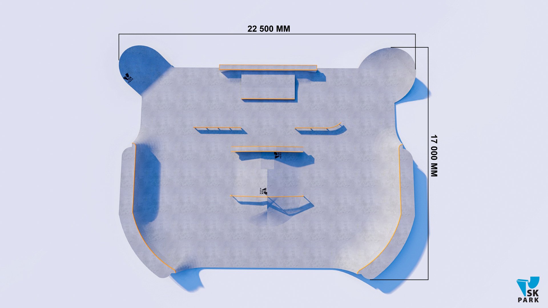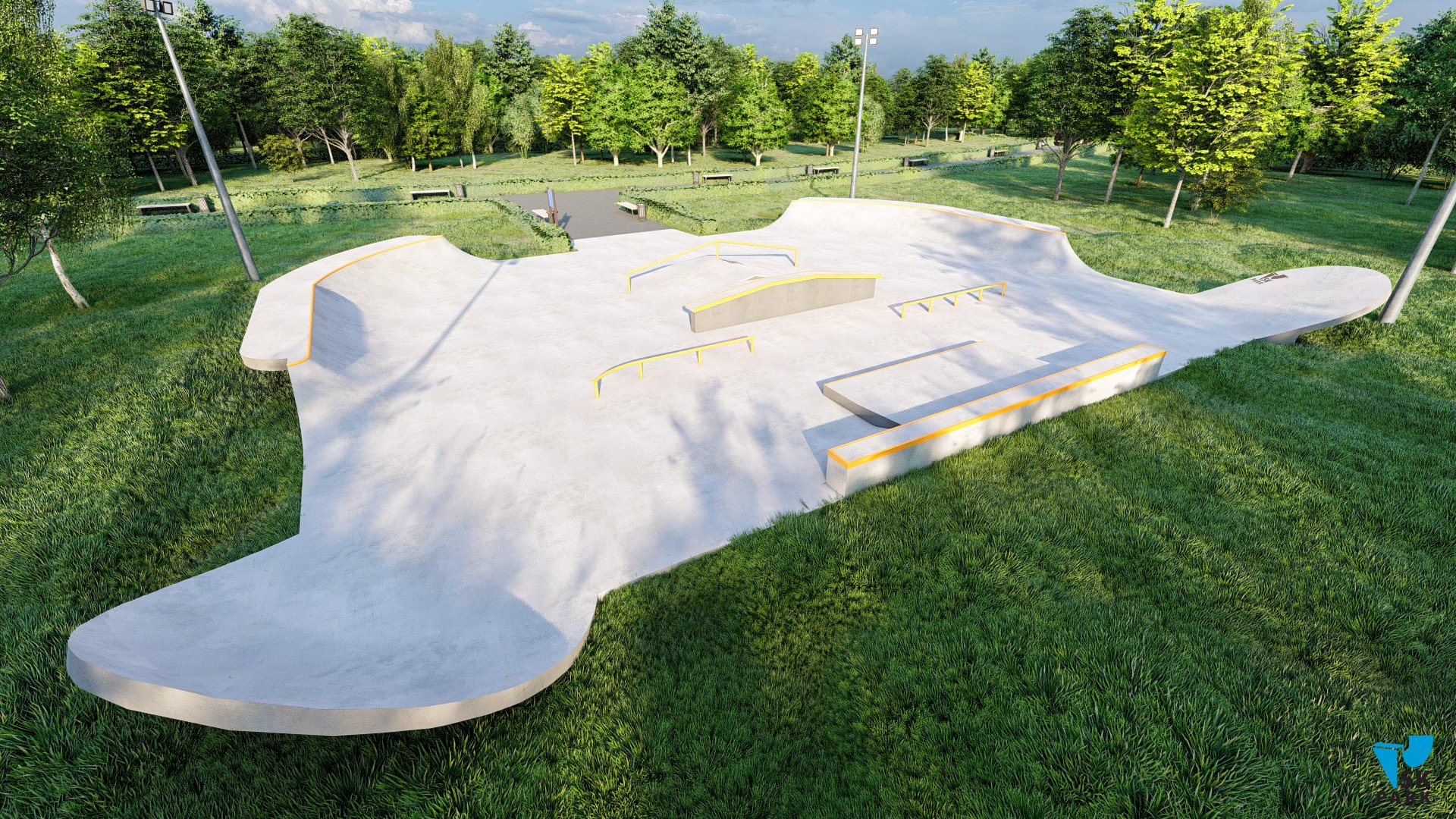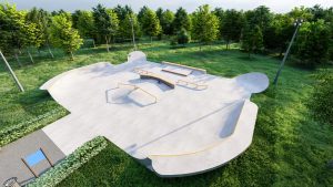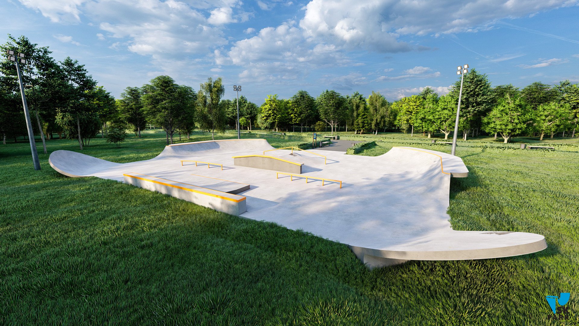 Небольшая скейт площадка спроектирована таким образом, что на ней могут тренироваться райдеры начинающего и среднего уровня. Разнообразие фигур подходит практически для всех видов трюков на скейтборде. В проекте предусмотрен универсальный фанбокс-книжка с пирамидой, перилами и грайндбоксом, на котором могут тренироваться как начинающие, так и профессиональные райдеры. Грайнбокс с мэнуалпэдом, оснащенные подкатом ориентированы на креативные тренировки навыков катания во всех заявленных дисциплинах. Высоты перил и граней подходят райдерам всех дисциплин(скейтбординг, ролики, кик скутер) и возрастов. Для тренировок базовых трюков по скольжениям, в проекте предусмотрены флэт перила.