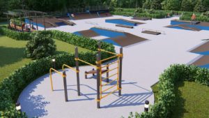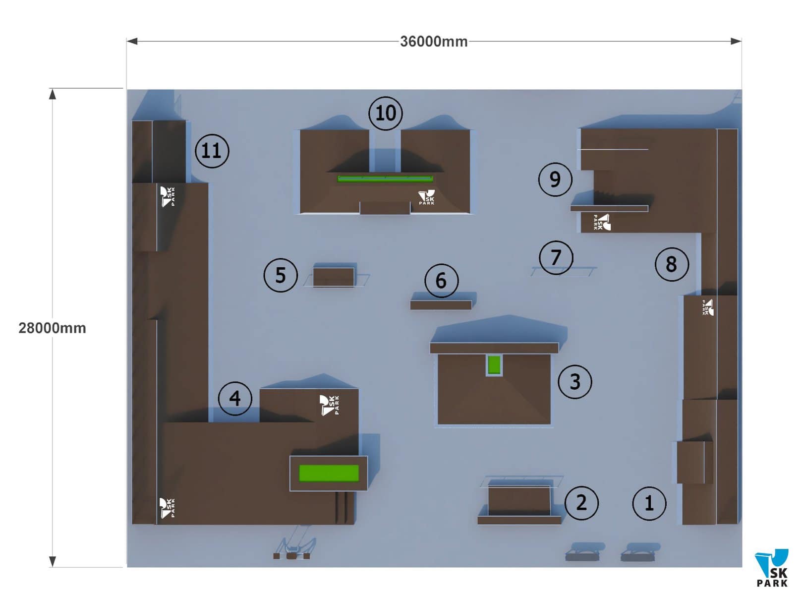 Проект скейтборд площадки содержит большое количество элементов для тренировки катания в «Стрите». Основными фигурами проекта являются 2 скейтплазы и Волна с волрайдом и перилой, имитирующие городские препятствия. (№10, 11, 4). Также в проекте предусмотрен Фанбокс с пирамидой для тренировки прыжков и выполнения трансферных трюков(№3). Скейт площадка подойдет для проведения соревнований и показательных выступлений по скейтбордингу. В проекте скейт парка предусмотрены фигуры для начинающих райдеров(№2, 6, 7, 8). Оборудование для скейт парка, также подойдет для катания на роликах и кик скутере. Отличное решение для размещения на спортивных объектах, парков отдыха, жилых комплексах, а также для любых других объектов обладающих подходящей площадью.