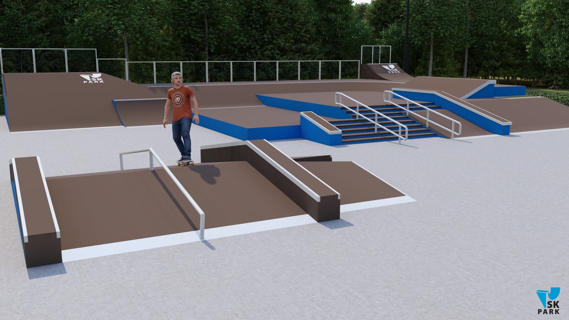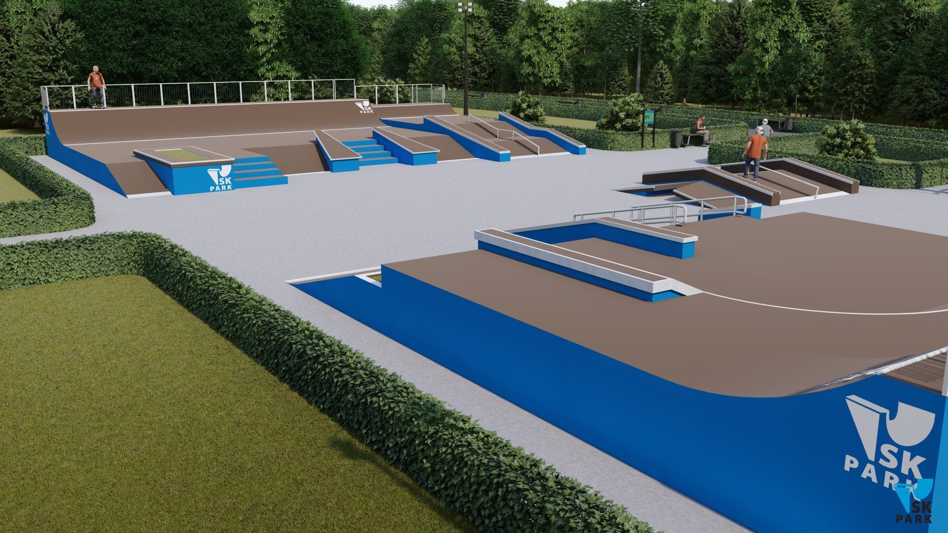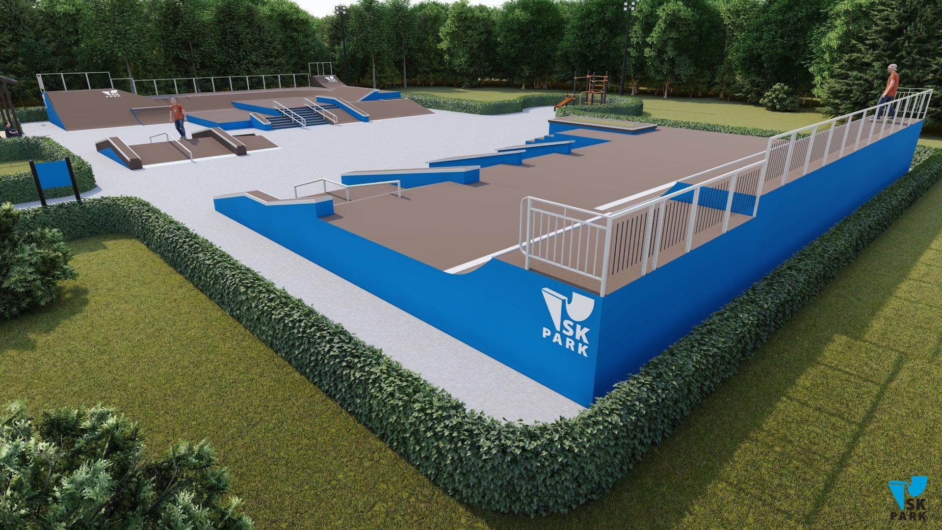 Основными фигурами скейт парка являются две мульти скейтплазы ( №1,2). Каждая из них имитирует препятствия городской среды, такие как: ступени, скаты, парапеты, перила, бэнки и волл райды. Первая мульти скейтплаза ( №1) вмещает в себя две наклонных перилы, проходящих через 8 ступеней.Благодаря боковому мэнуал паду с кикером имеется возможность скользить по периле на более короткую длину – в 5 ступеней, что очень удобно в изучении трюков для начинающих райдеров. Также плаза включает в себя два еврогэпа - классический и через ступени, два бэнка, в которых можно выполнять трансферные трюки, а также волл райд переходящий в полукруглый квотерпайп. Вторая мульти скейтплаза (фигура №2) включает в себя: