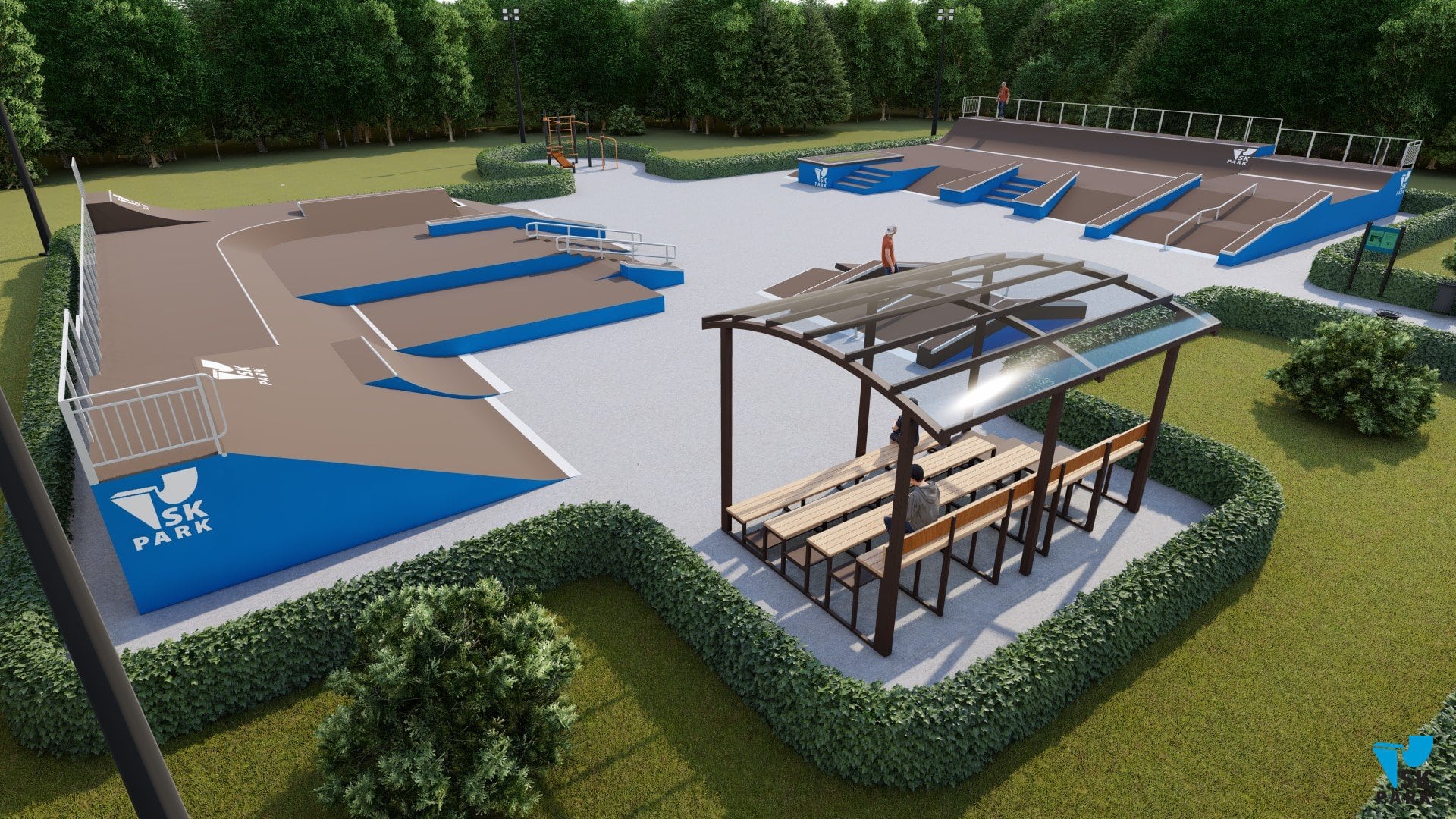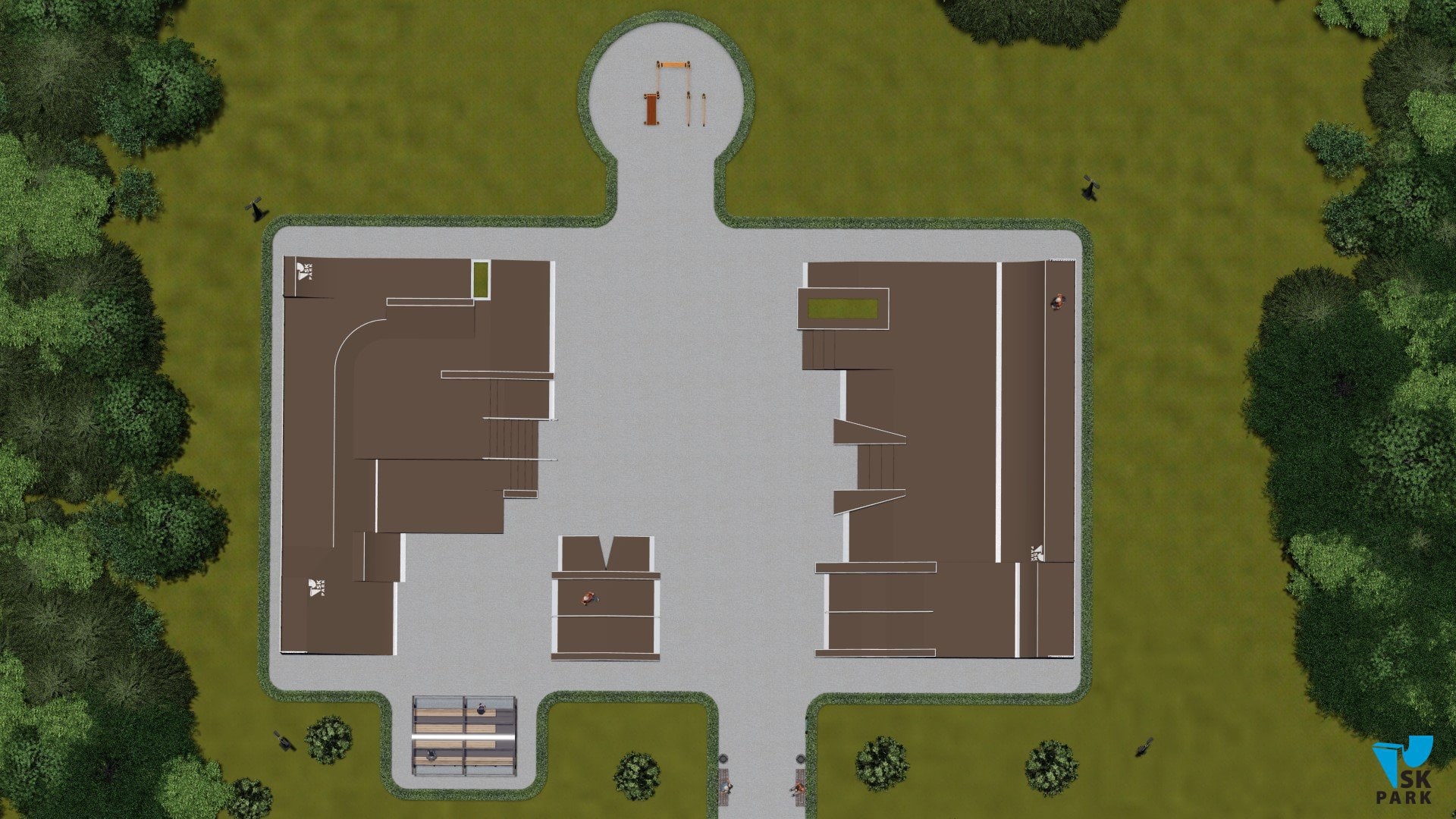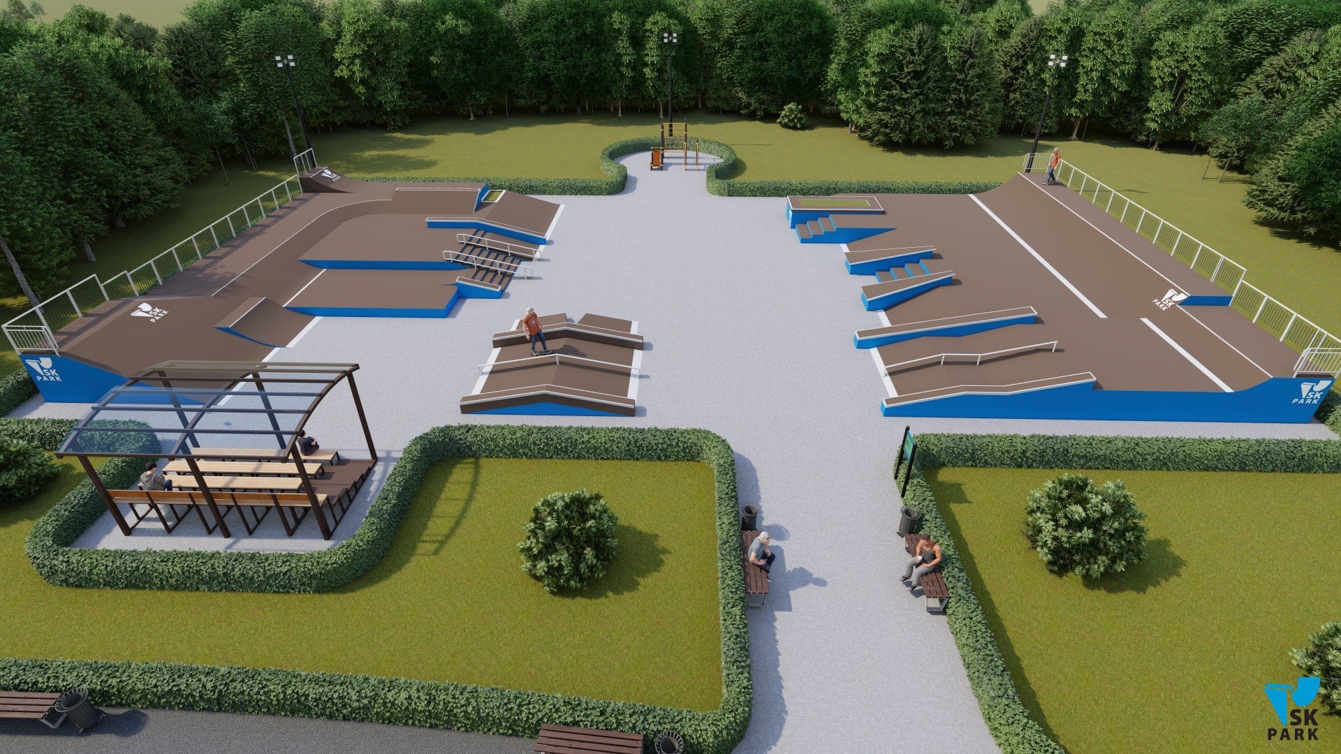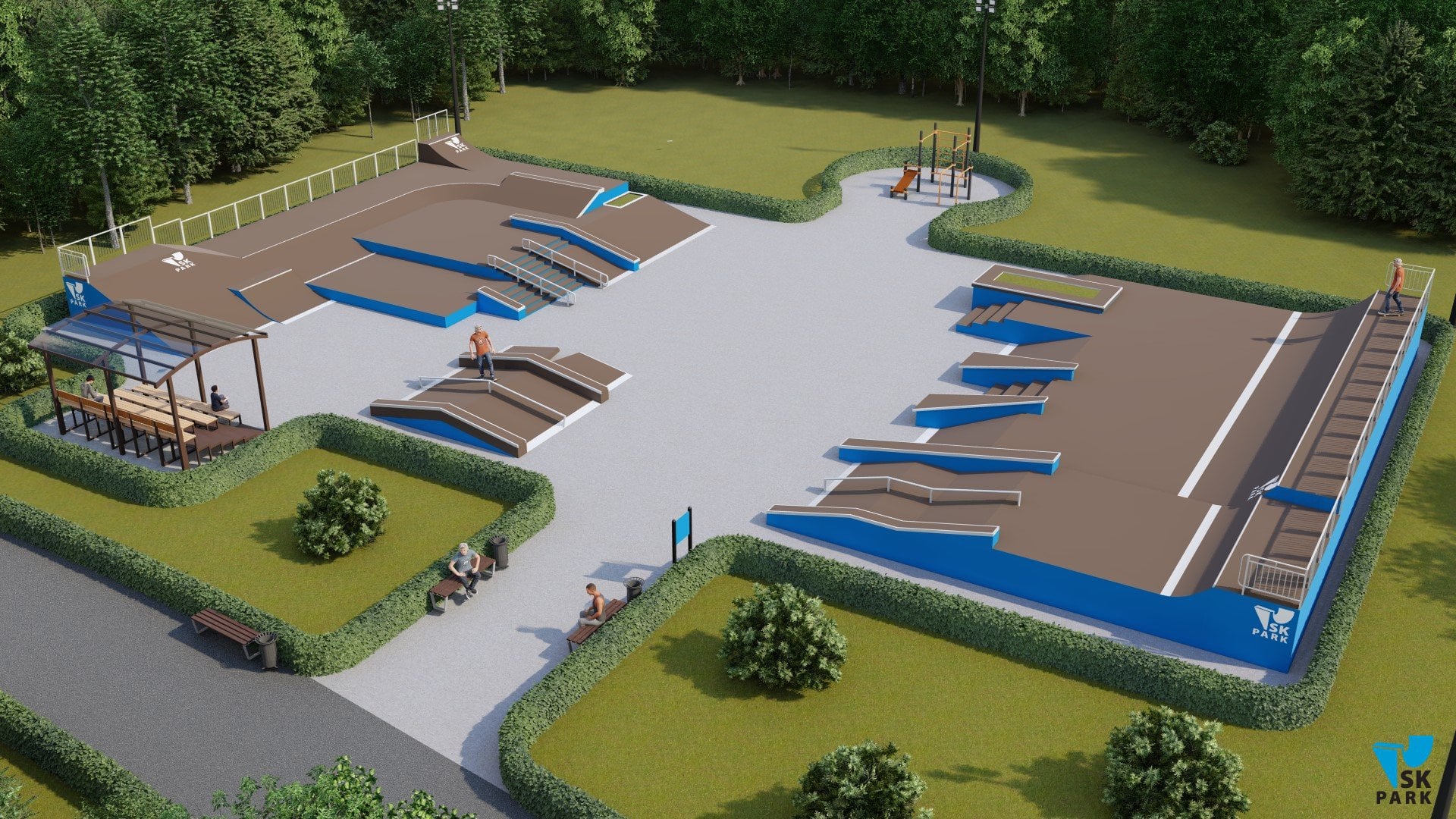 Основными фигурами скейт парка являются две мульти скейтплазы ( №1,2). Каждая из них имитирует препятствия городской среды, такие как: ступени, скаты, парапеты, перила, бэнки и волл райды. Первая мульти скейтплаза ( №1) вмещает в себя две наклонных перилы, проходящих через 8 ступеней.Благодаря боковому мэнуал паду с кикером имеется возможность скользить по периле на более короткую длину – в 5 ступеней, что очень удобно в изучении трюков для начинающих райдеров. Также плаза включает в себя два еврогэпа - классический и через ступени, два бэнка, в которых можно выполнять трансферные трюки, а также волл райд переходящий в полукруглый квотерпайп. Вторая мульти скейтплаза (фигура №2) включает в себя: