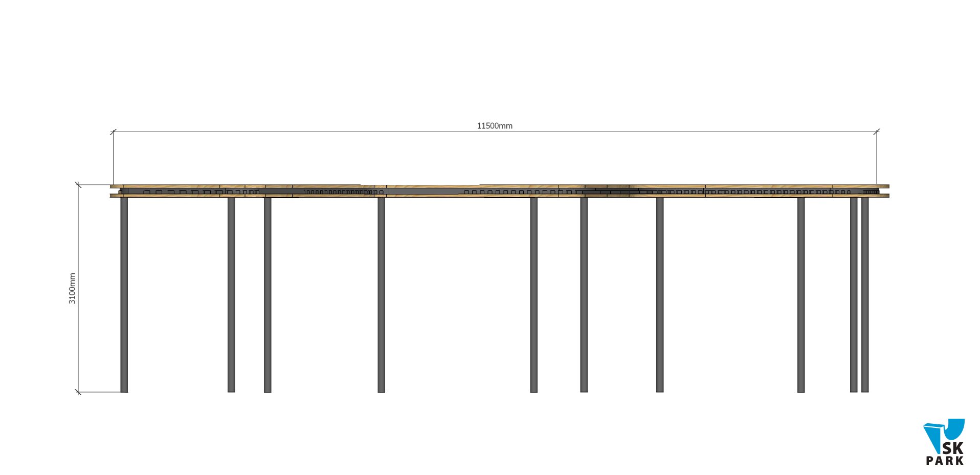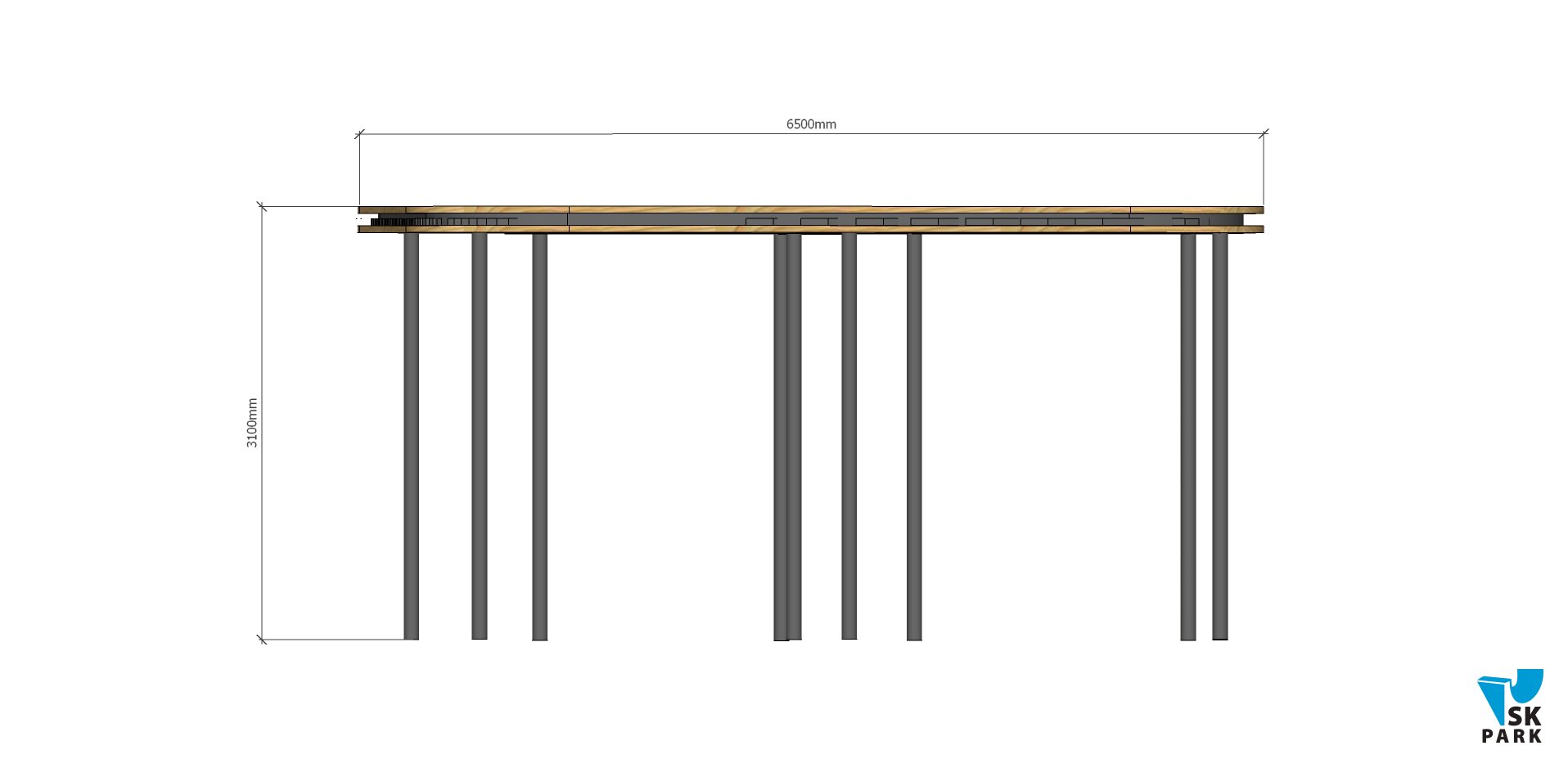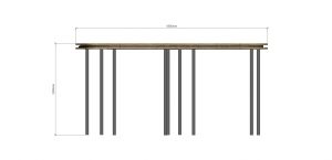 Конструкция навеса состоит из десяти металлических стоек произведенных из стальной трубы диаметром 108мм, теневого навеса из сотового поликарбоната, толщиной – 8 мм и деревянной решетки, произведенной из досок.