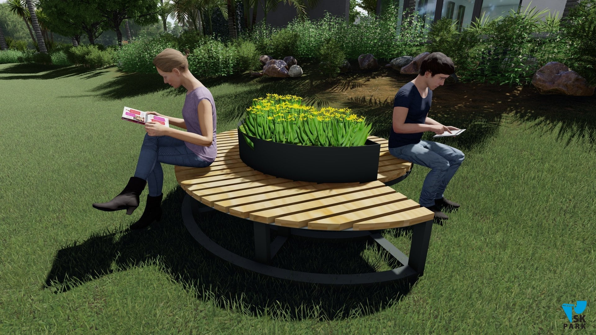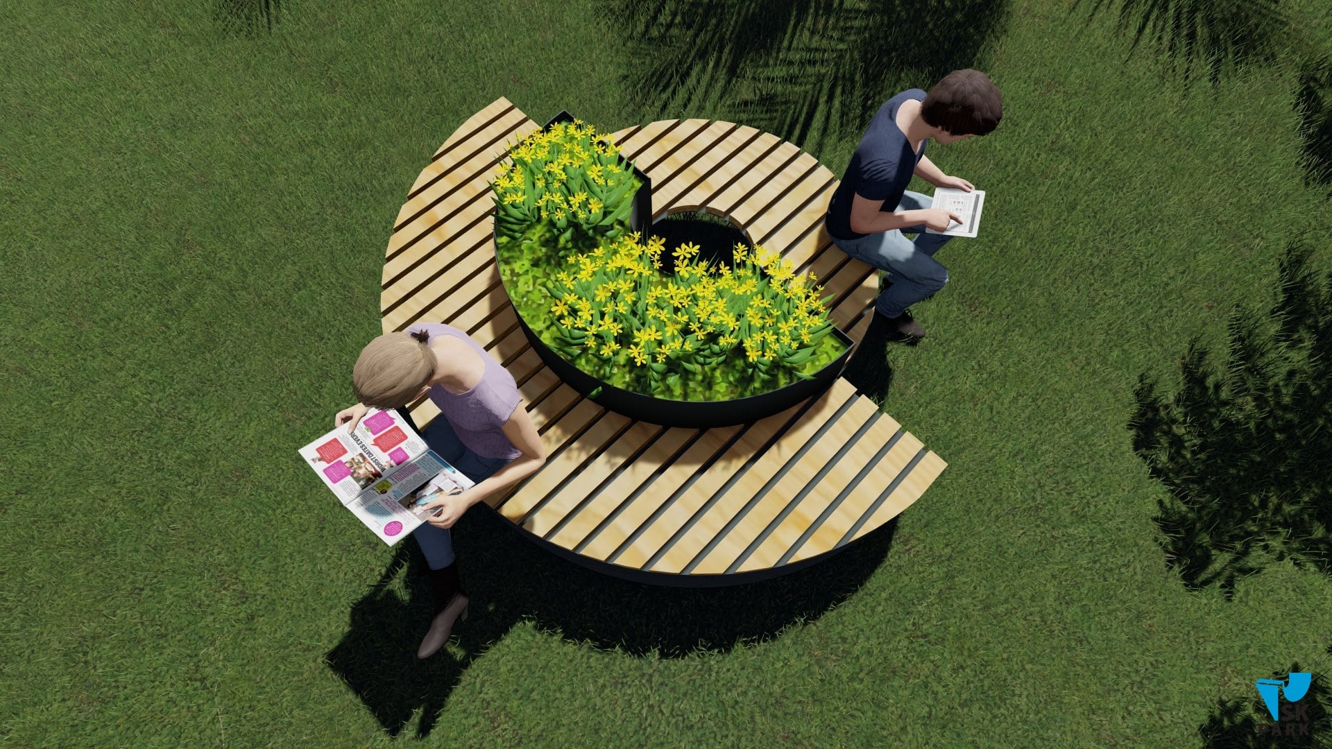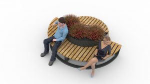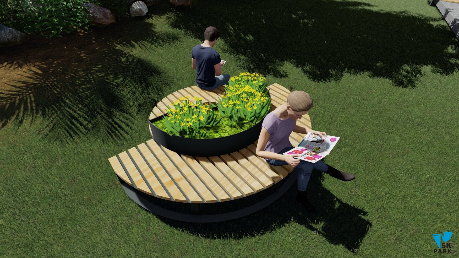 Скамья одновременно является клумбой для растений, что предает ей эстетичный внешний вид.
