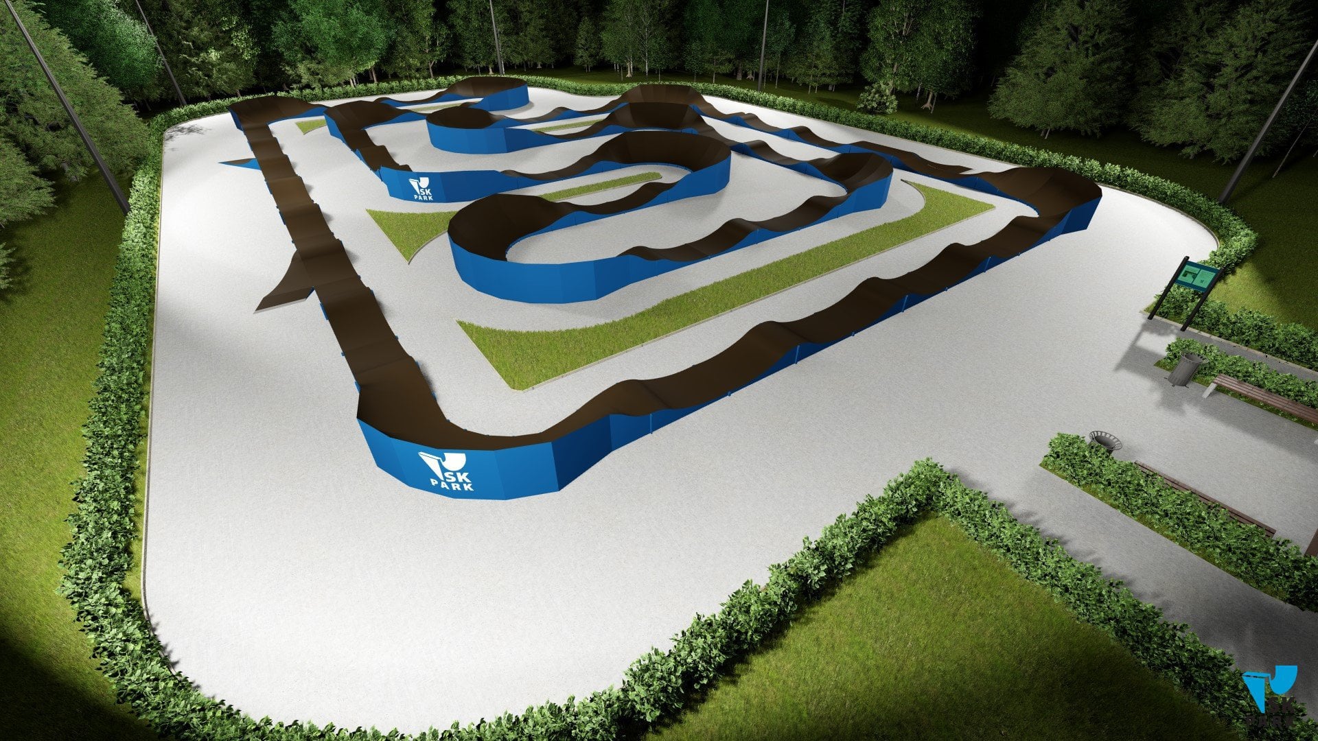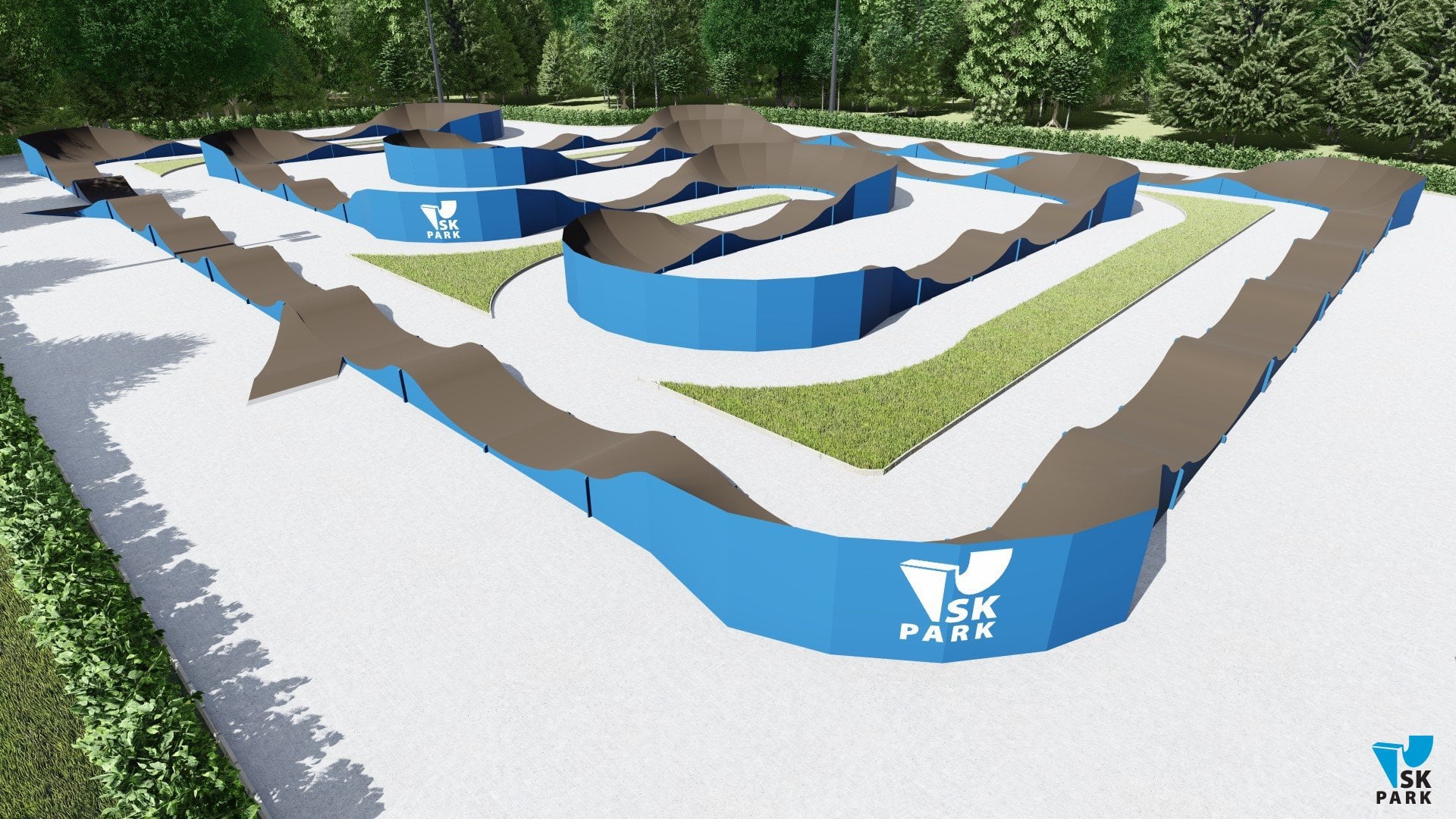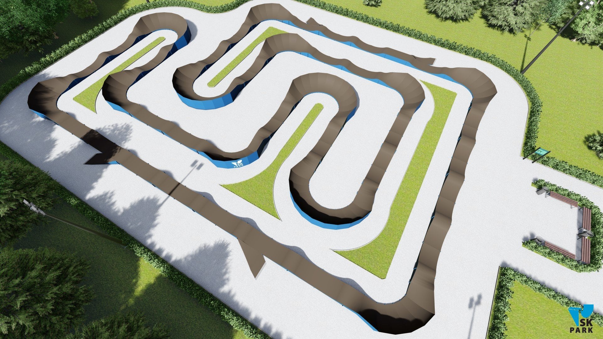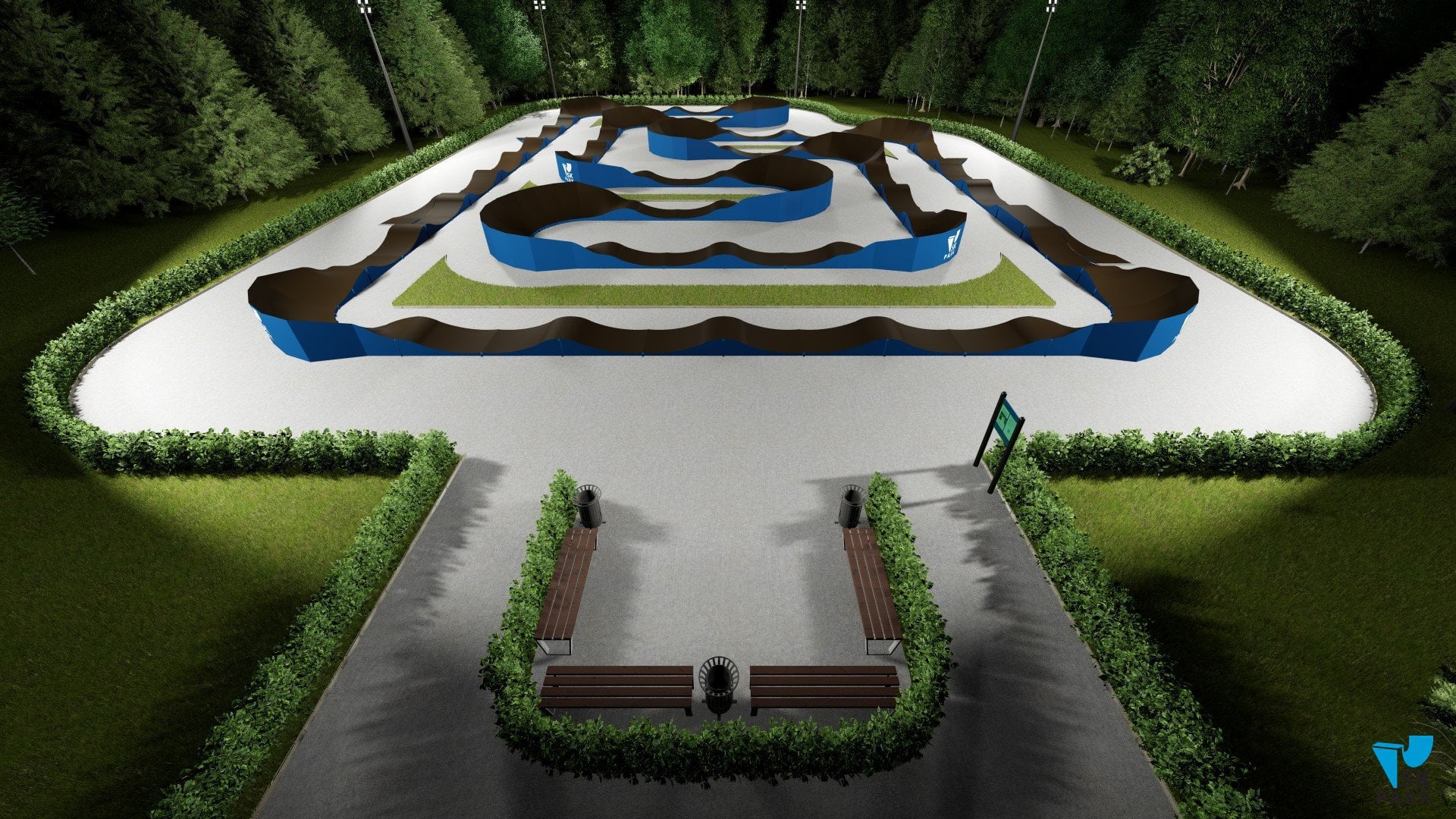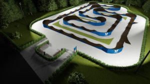 Универсальный памп трек. Подходит для любого уровня райдеров, а также для тренировки спорстменов в олимпийской дисциплине «BMX race». Памптрек предусматривает 4 поворота на 180 градусов и 8 поворотов на 90 градусов. Подходит для проведения соревнований, показательных выступлений и памп-батлов. Общая длина трассы – 216 метров. Отличное решение для спортивных объектов, парков отдыха, образовательных учреждений, жилых комплексов, а также для любых других объектов обладающих подходящей площадью.
