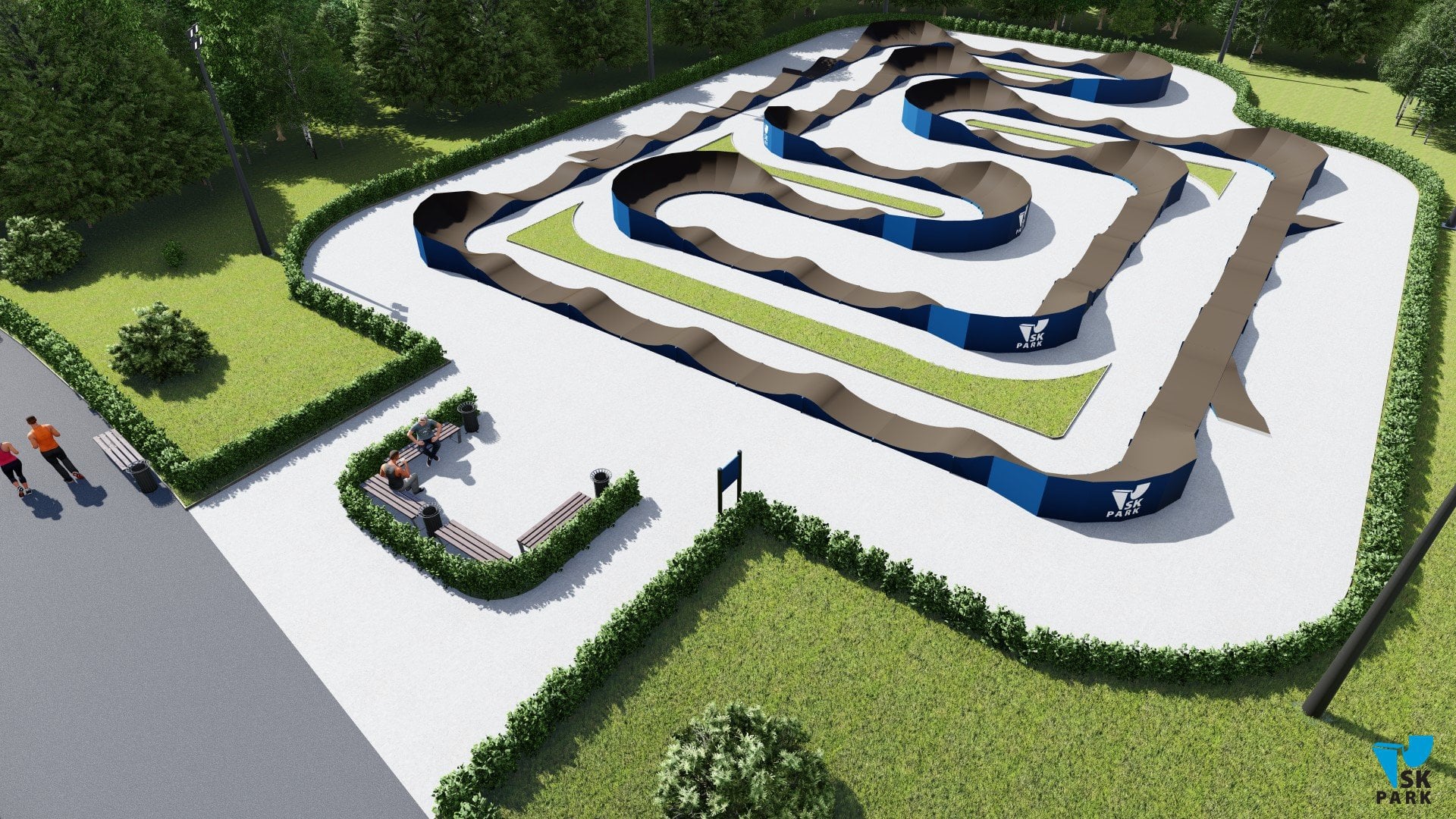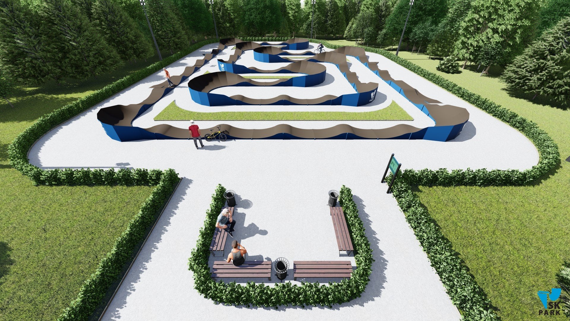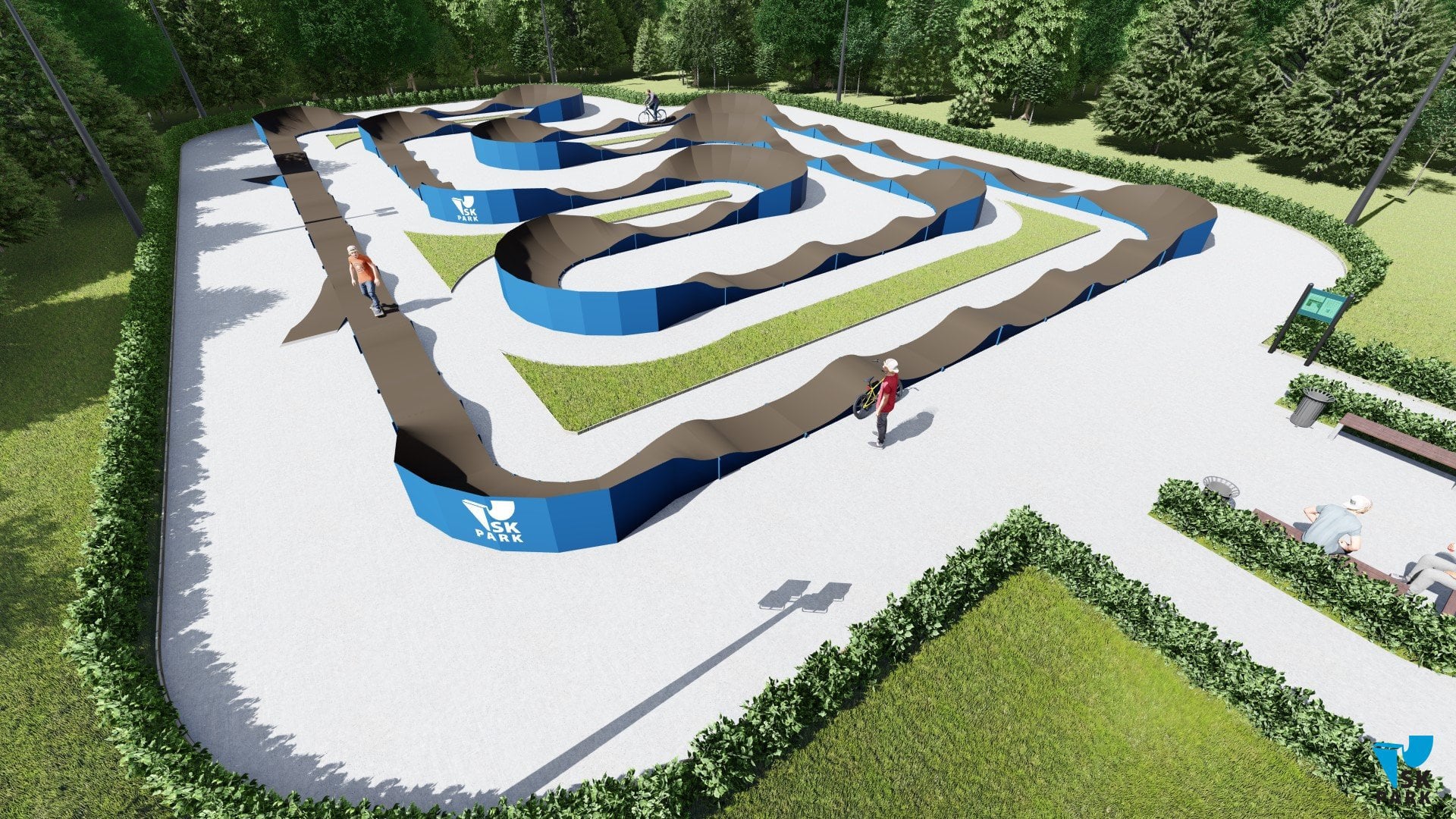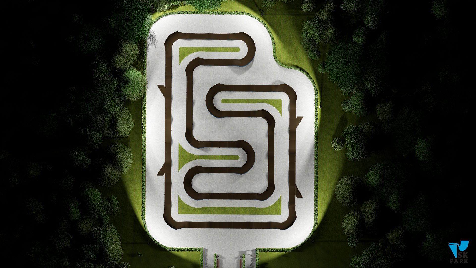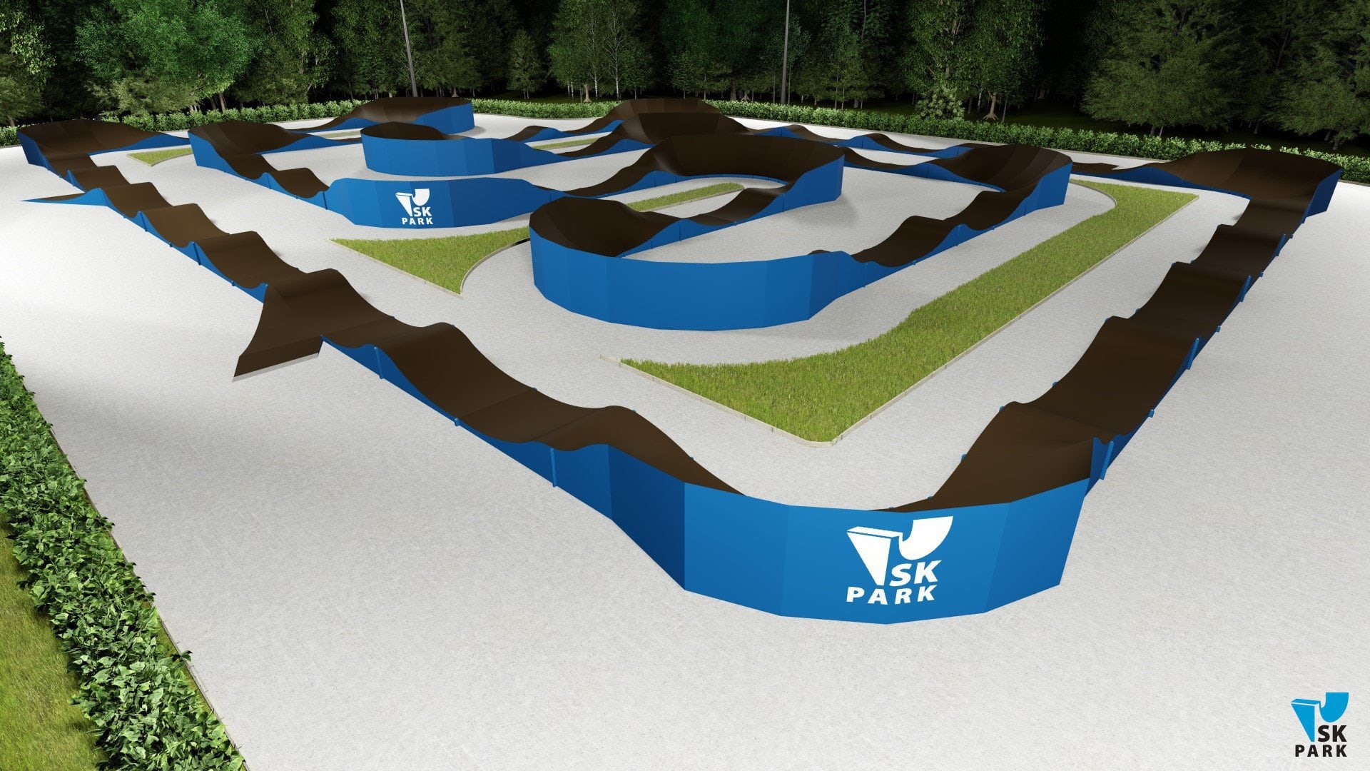 Универсальный памп трек. Подходит для любого уровня райдеров, а также для тренировки спорстменов в олимпийской дисциплине «BMX race». Памптрек предусматривает 4 поворота на 180 градусов и 8 поворотов на 90 градусов. Подходит для проведения соревнований, показательных выступлений и памп-батлов. Общая длина трассы – 216 метров. Отличное решение для спортивных объектов, парков отдыха, образовательных учреждений, жилых комплексов, а также для любых других объектов обладающих подходящей площадью.