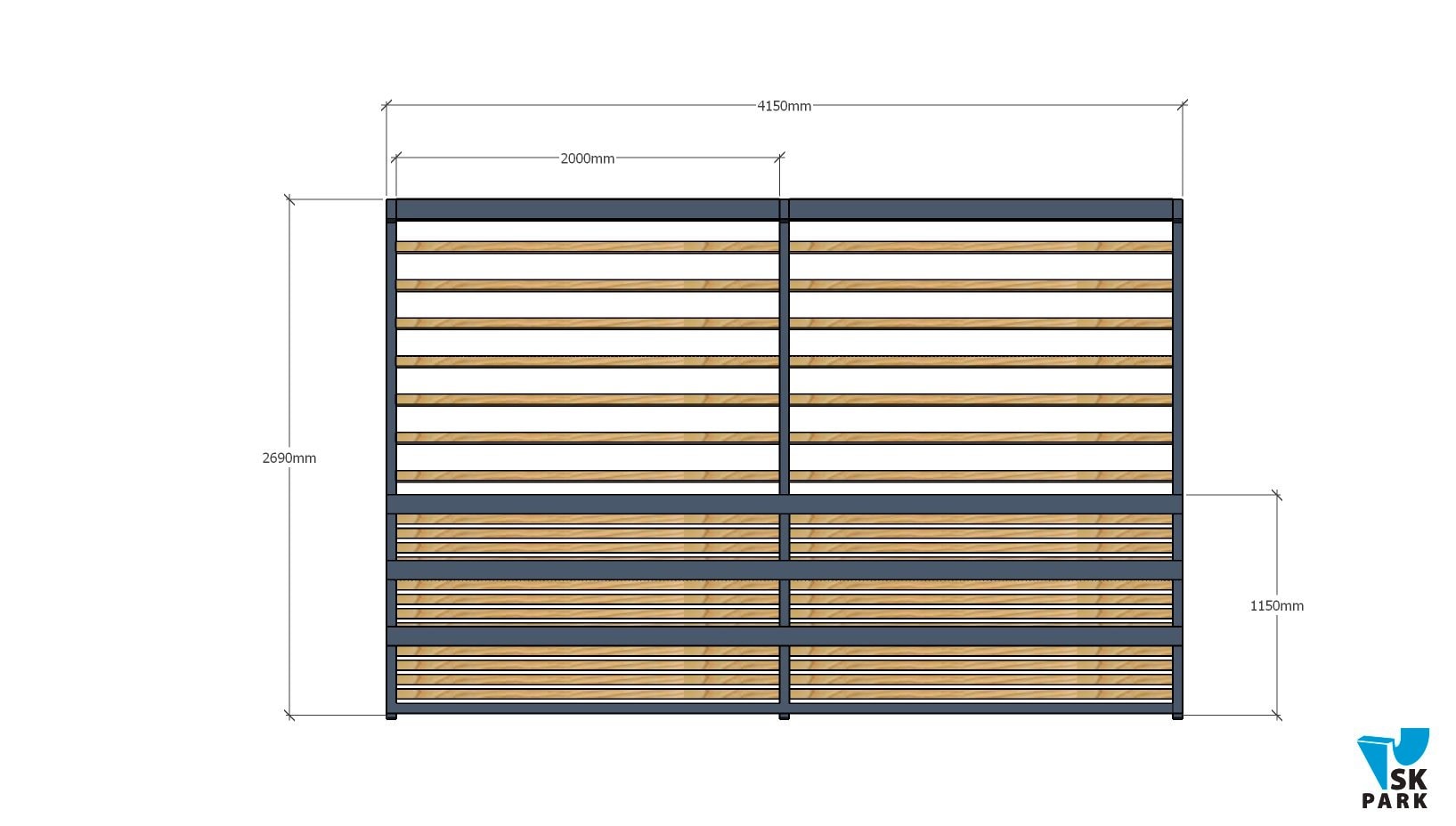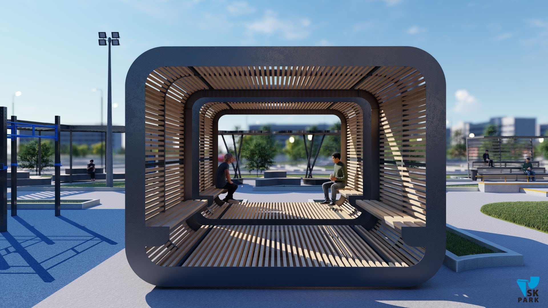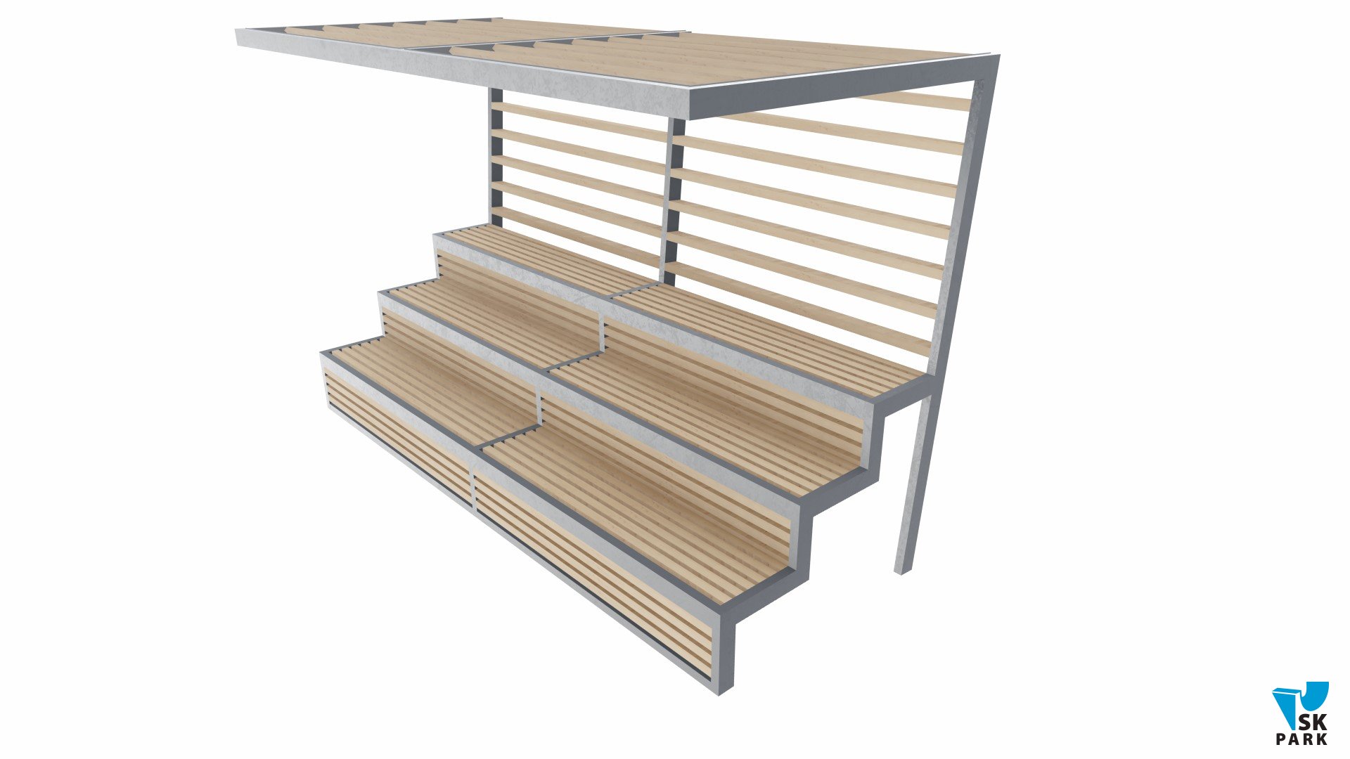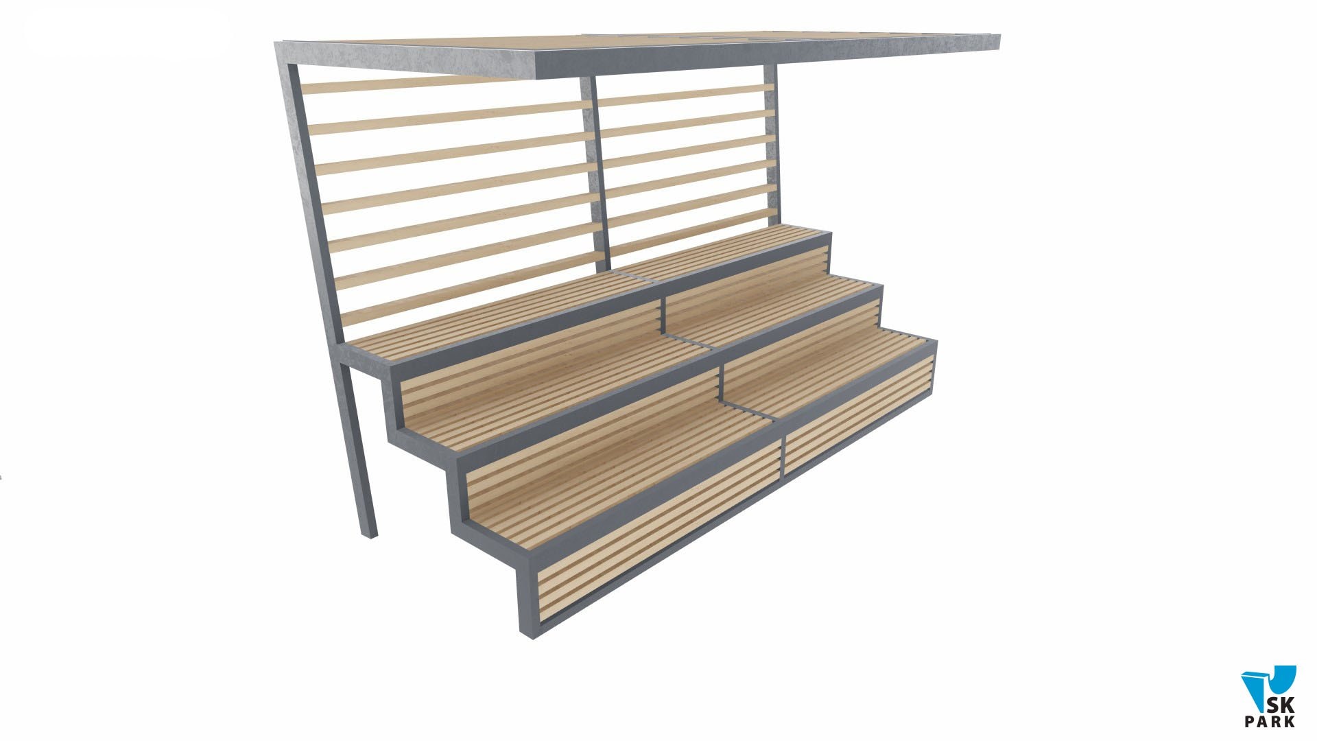 Трибуны расположены возле скейтпарка и позволяют удобно наблюдать за происходящем в нем.Также трибуны являются отличным местом где райдеры могут одеть экипировку и оставить на них свои вещи во время катания. Навес трибуны обеспечит хорошую теневую защиту и защиту от осадков для отдыхающих и создаст эстетический вид общественного спортивного пространства.