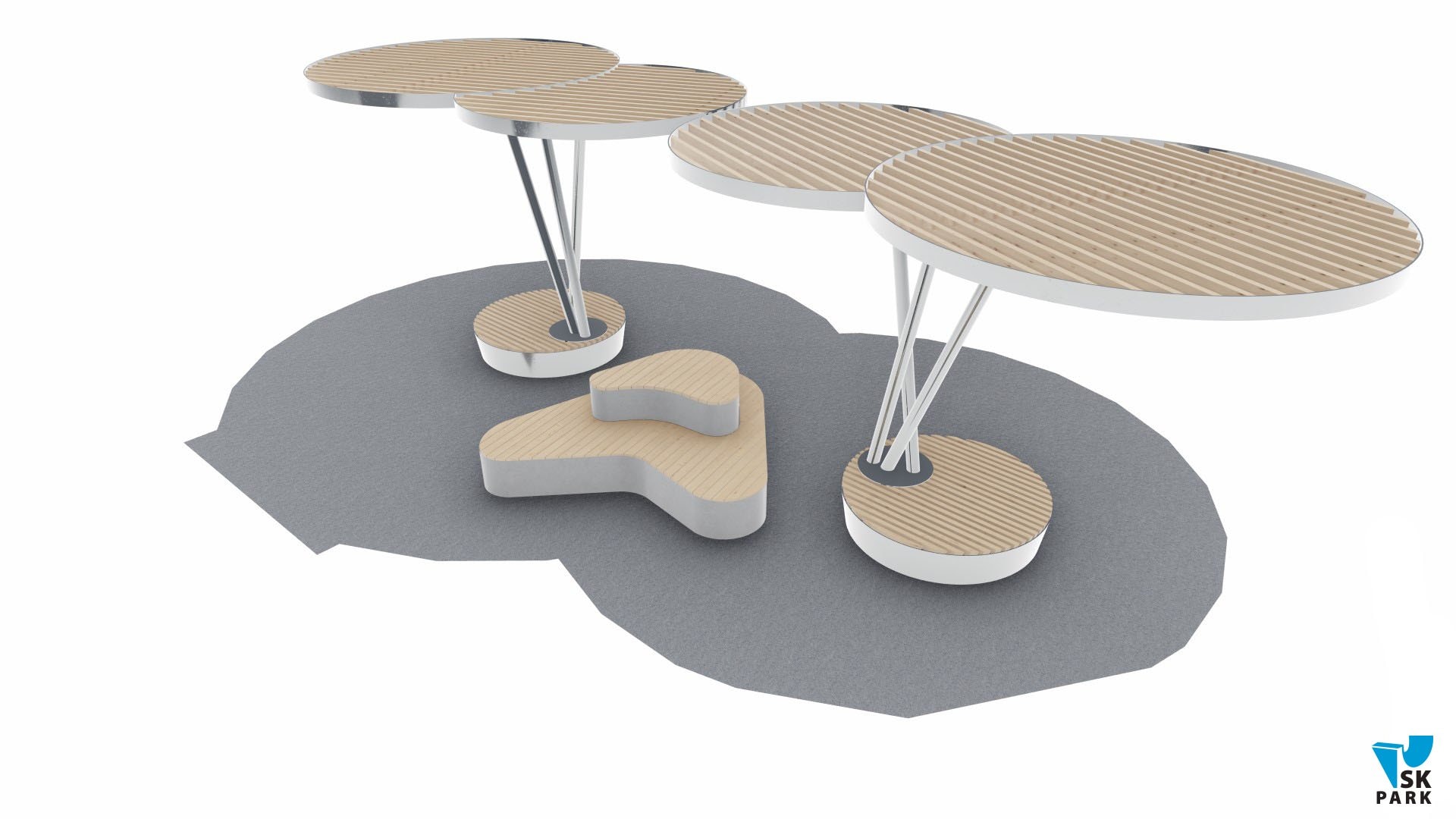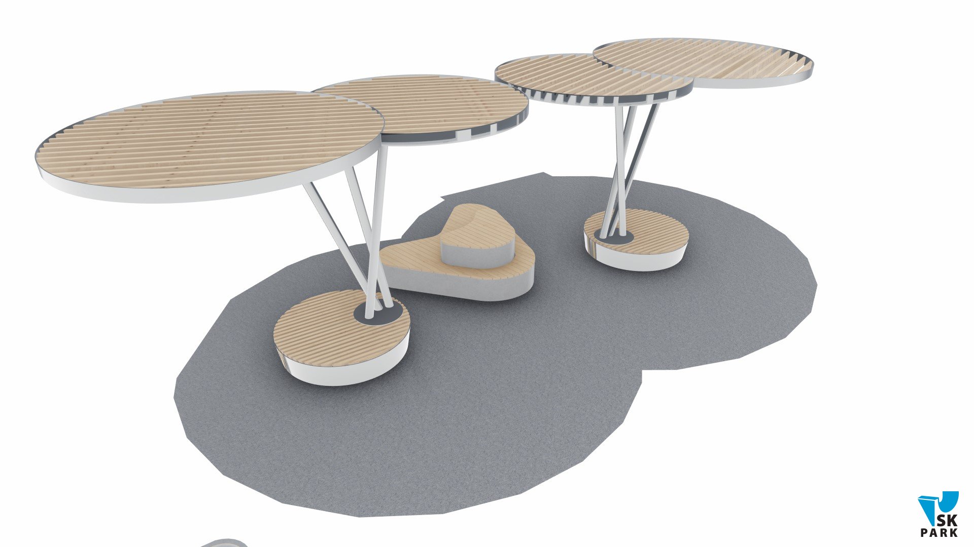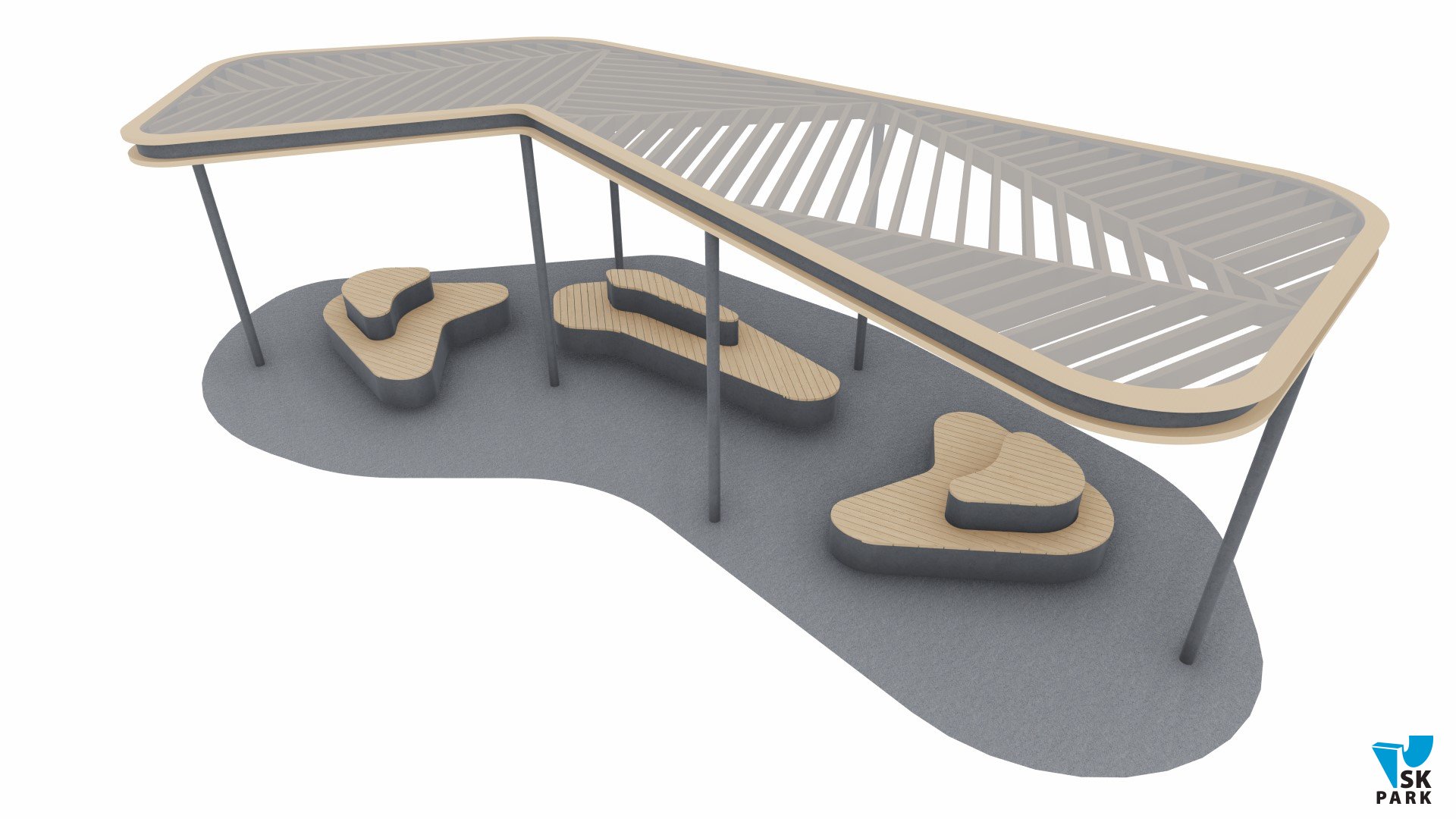 Пергола с двумя круглыми теневыми навесами. Обеспечит хорошую теневую защиту для отдыхающих и создаст эстетический вид общественного пространства. Каждая пергола оборудована местом для сидения, рассчитанная на 7 человек
