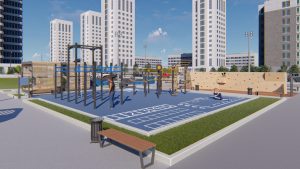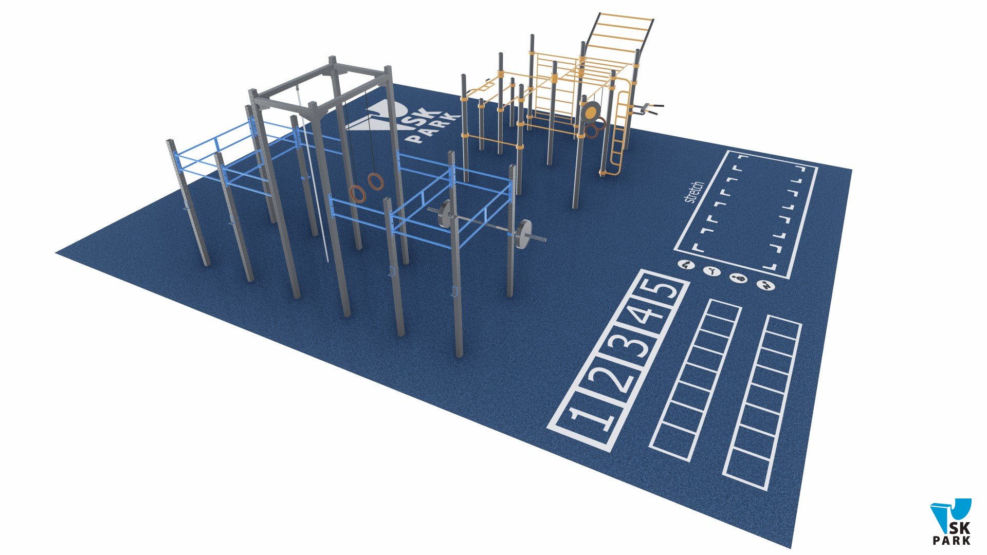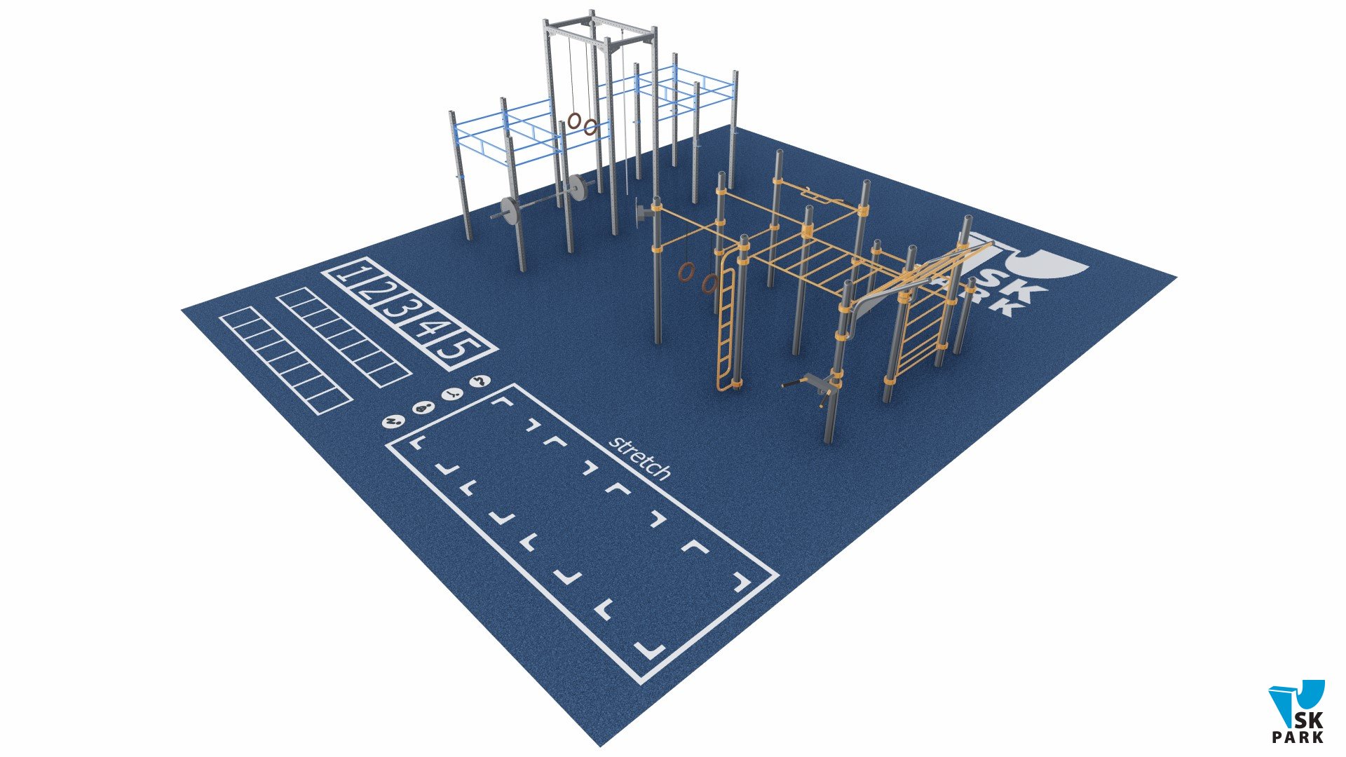 Зона воркаут в которой можно выполнять множество различных упражнений по воркауту и ОФП.Все оборудование для воркаута в данной зоне является многофункциональным подходит для развития большинства групп мышц. Высоту турников можно регулировать и закреплять на необходимом уровне. Турники могут использоваться как для подтягиваний, так и для закрепления аксессуаров: петель, колец, канатов, амортизаторов и т.д. В проекте предусмотрена участок для разминки и стрейчинга, а также нанесена разметка для выполнения различных аэробных и физических упражнений