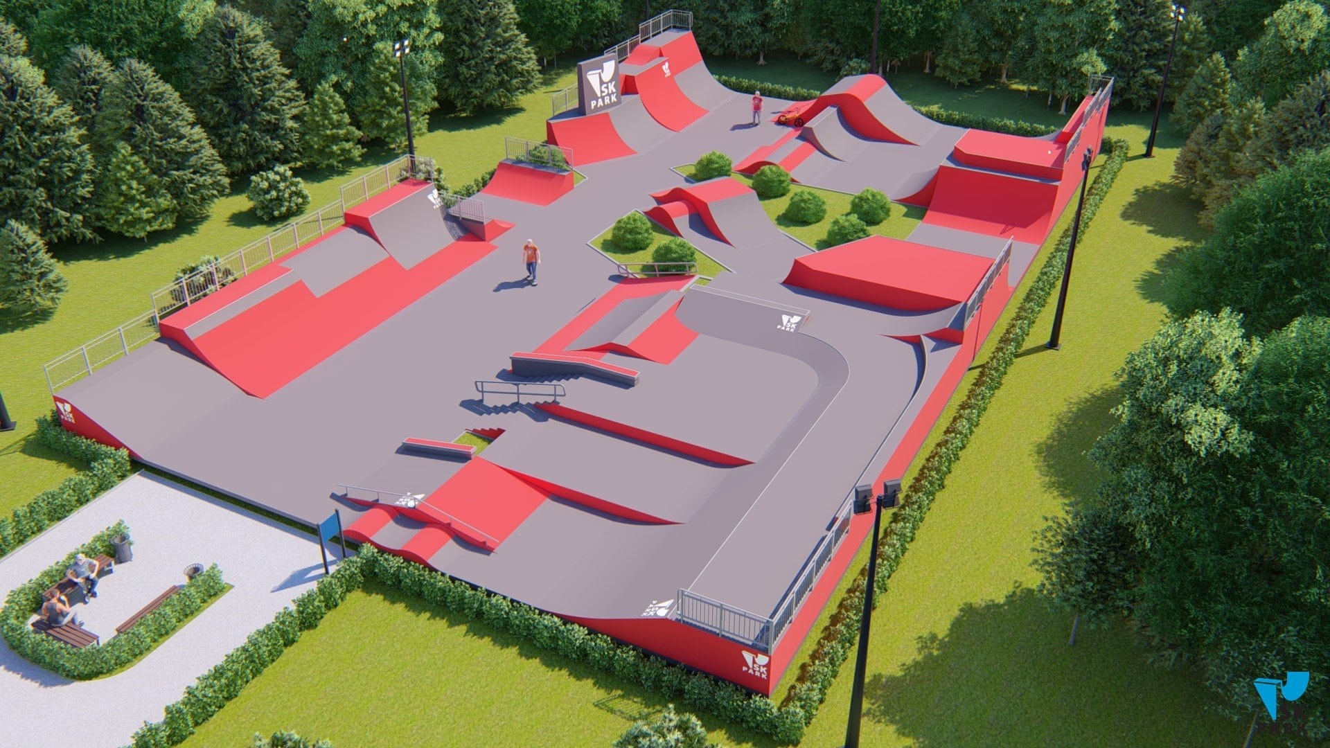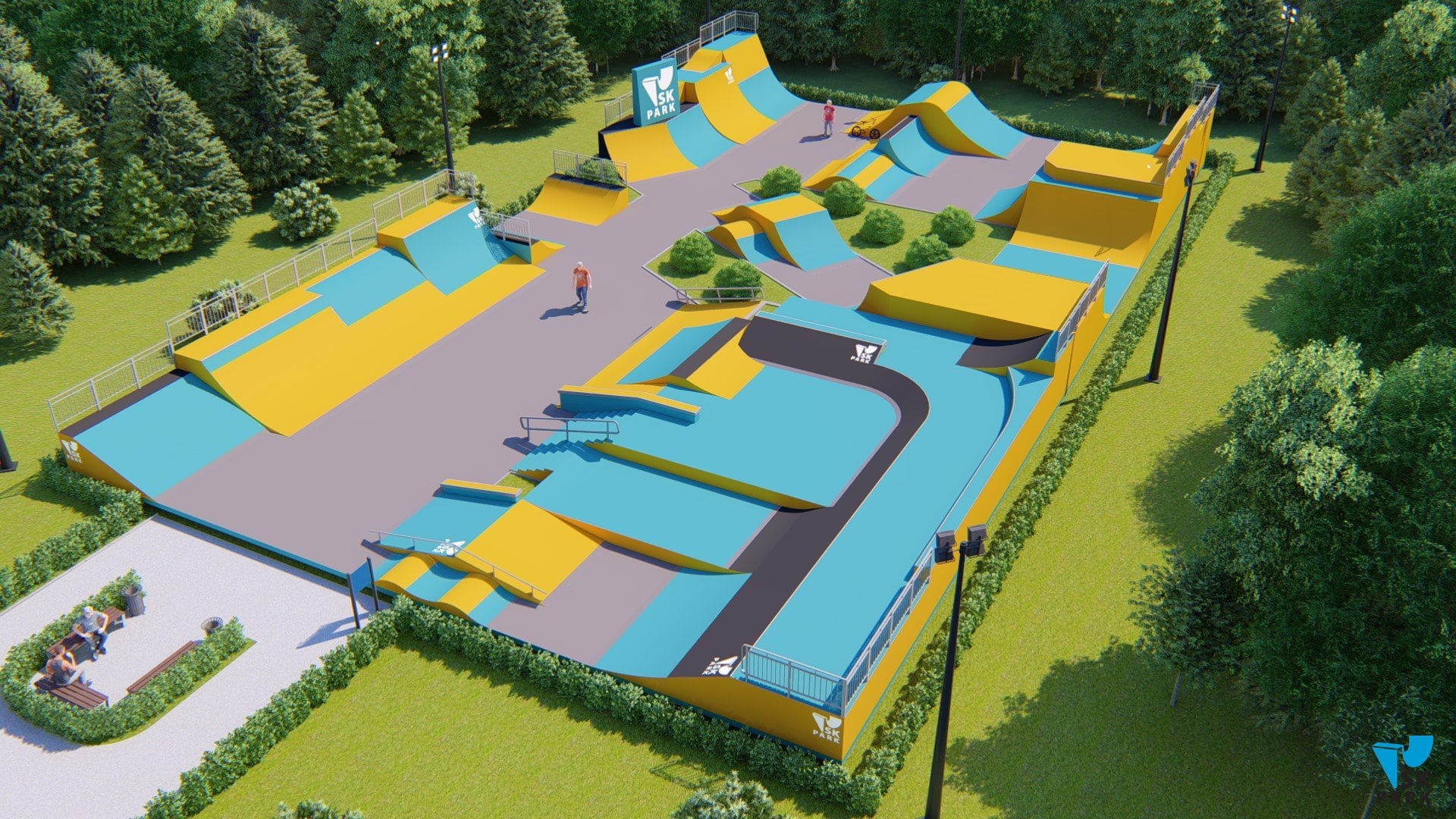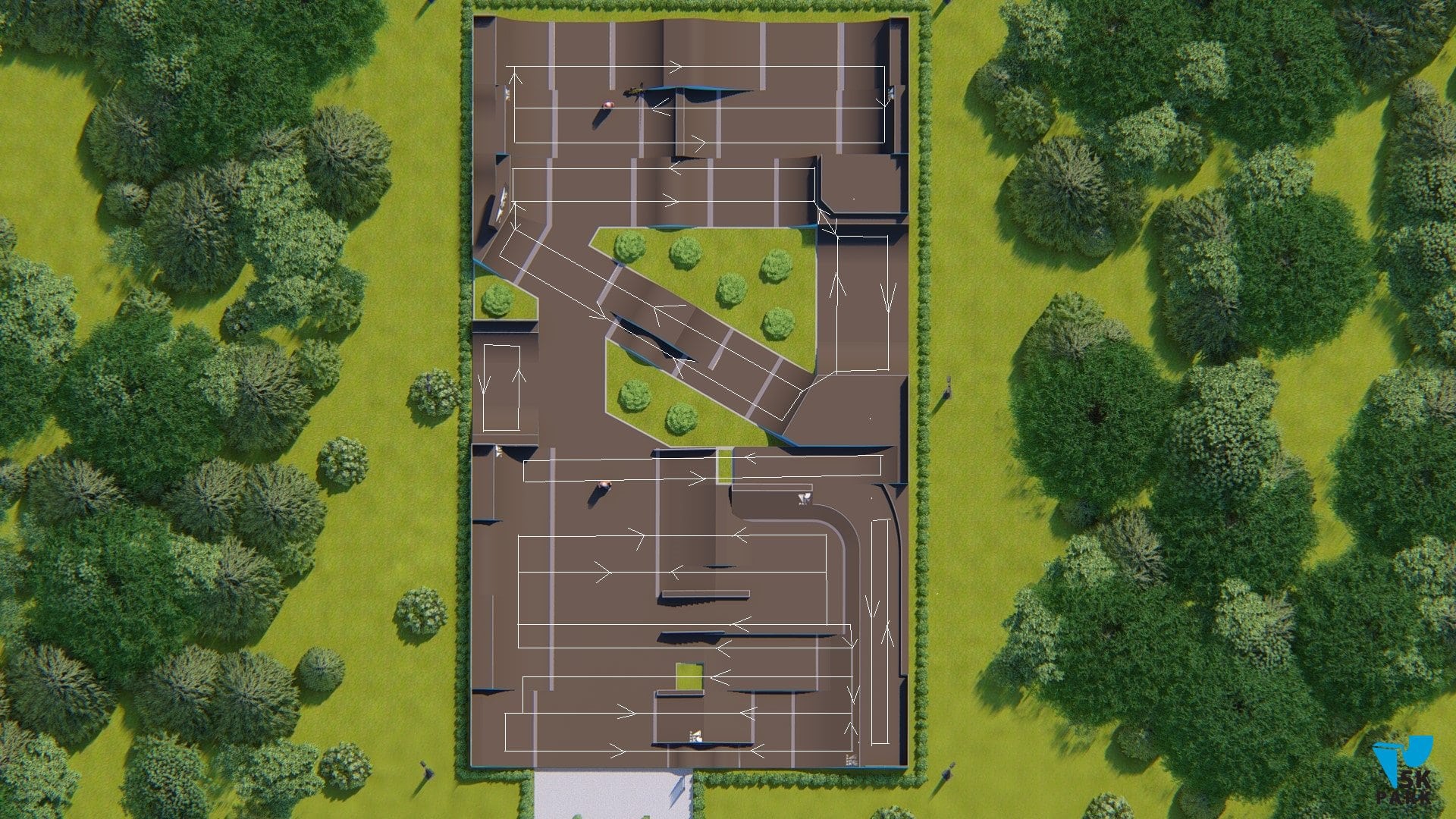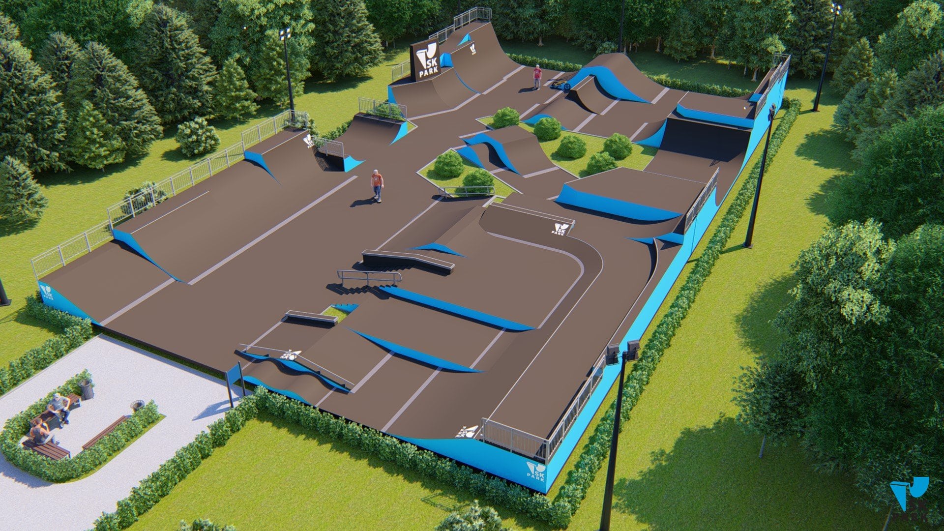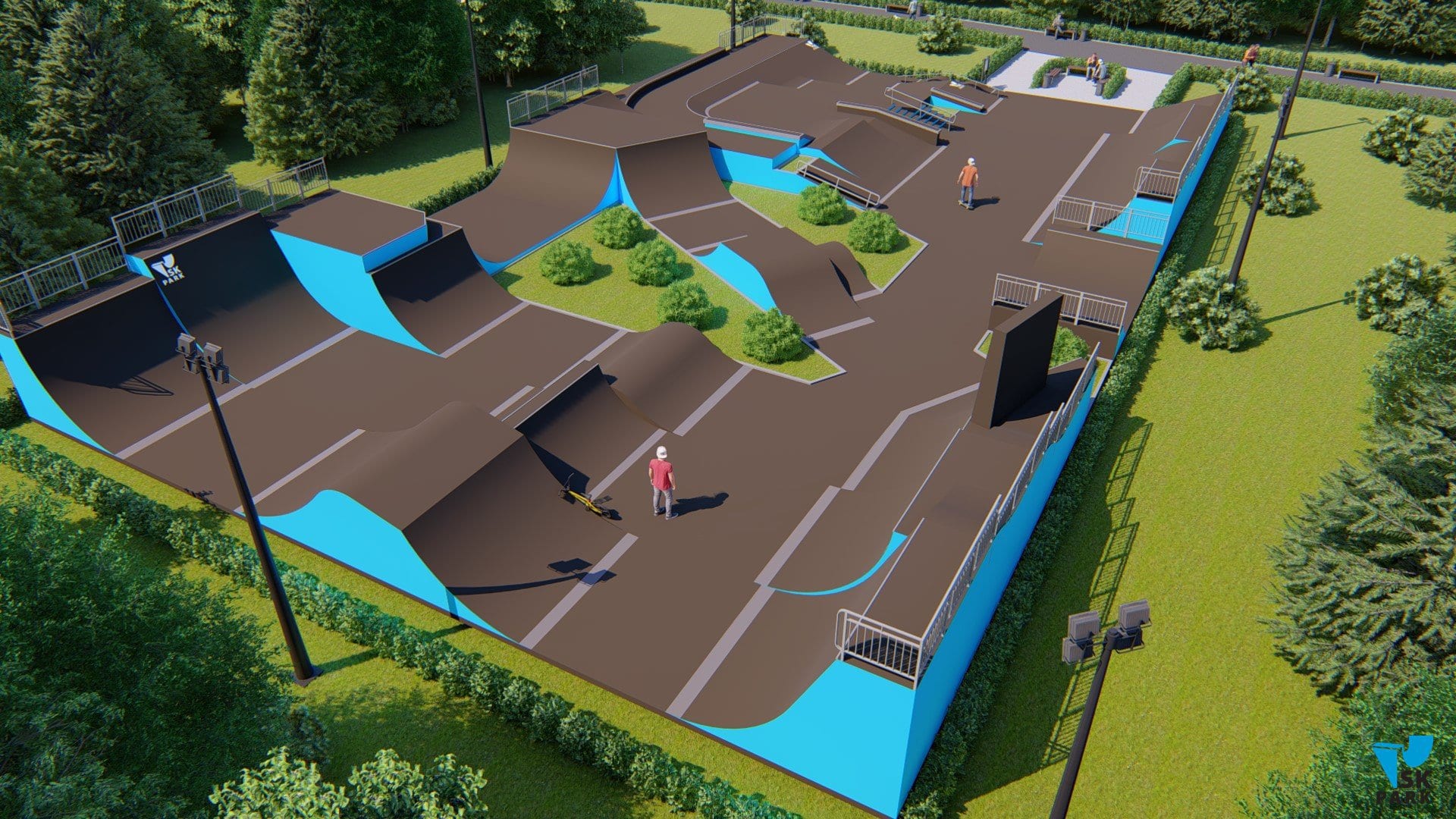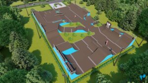 - Зона для BMX, площадью - 388 кв.м., включающая в себя 4 линии фигур для выполнения серий прыжков. В данную зону входят 4 фигуры которые позволяют выполнять серии трюков по прыжкам, а также мини рампа высотой - 2 метра. Геометрия и размеры фигур в bmx зоне рассчитаны, чтобы катание было максимально эффективным и безопасным для райдеров.