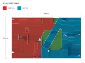 - Зона для скейтбординга площадью - 434 кв.м., включающая в себя многофункциональную скейт плазу, фан-бокс книжку, дабл вэйв, а также мини рампу высотой 1 метр, которая идеально подойдет для катания начинающих райдеров. Данная зона идеально повторяет препятствия городской среды такие как: ступени скаты, парапеты, перила и различные выступы, что позволяет райдерам проводить тренировки в дисциплине «Стрит». Оборудование подходит для тренировки и подготовки спортсменов к олимпийским играм в дисциплине «скейтбординг».