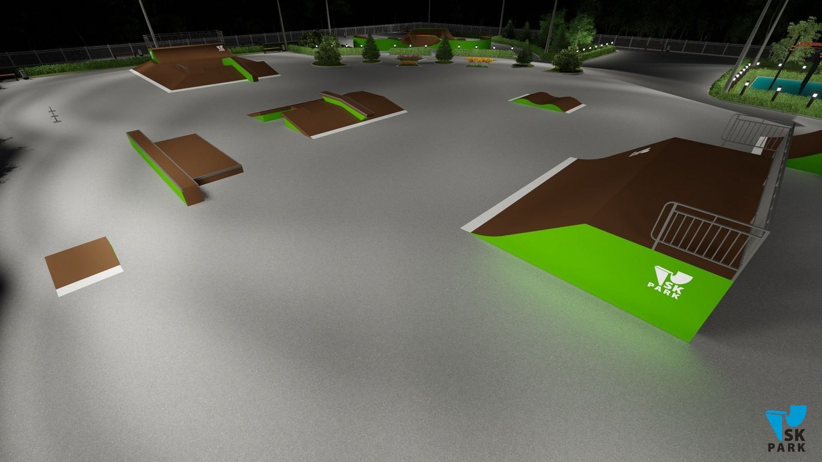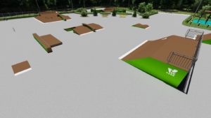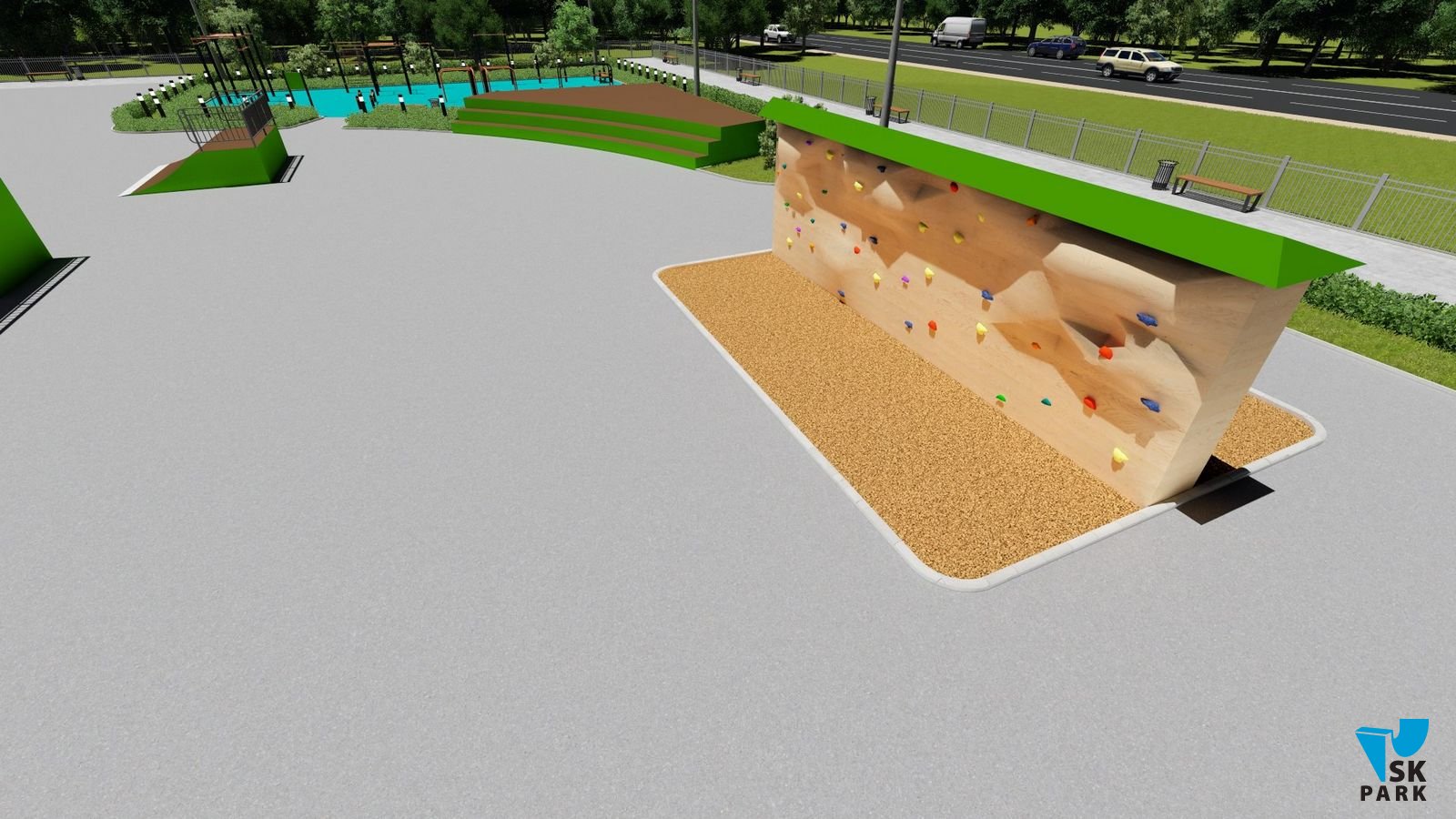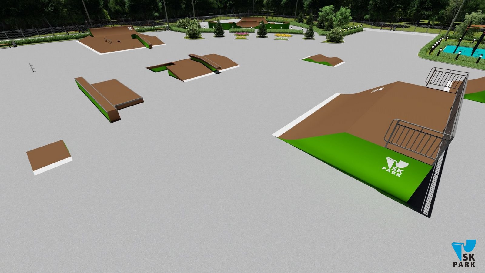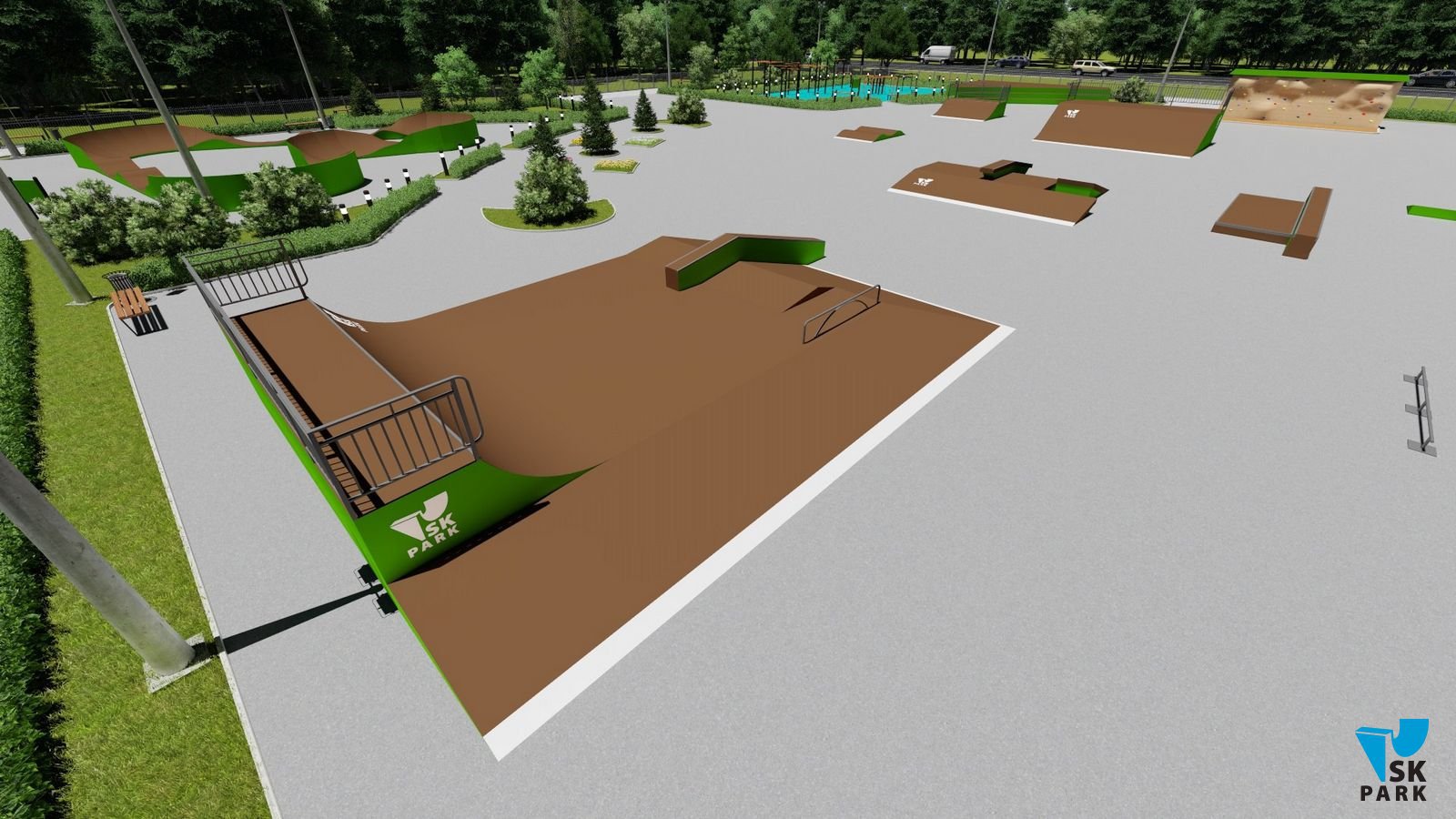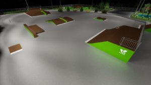 Данный проект ориентирован для катания на скейтборде, для райдеров с начинающим и средним уровнем катания. Основными фигурами проекта являются – трансферная скейт-плаза и широкий фанбокс, имитирующие городские препятствия. Предусмотрена линия фигур для изучения базовых трюков по прыжкам и скольжениям. Также оборудование подходит для катания на роликах и кик скутере.