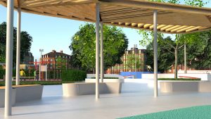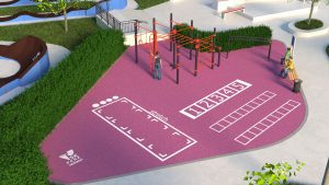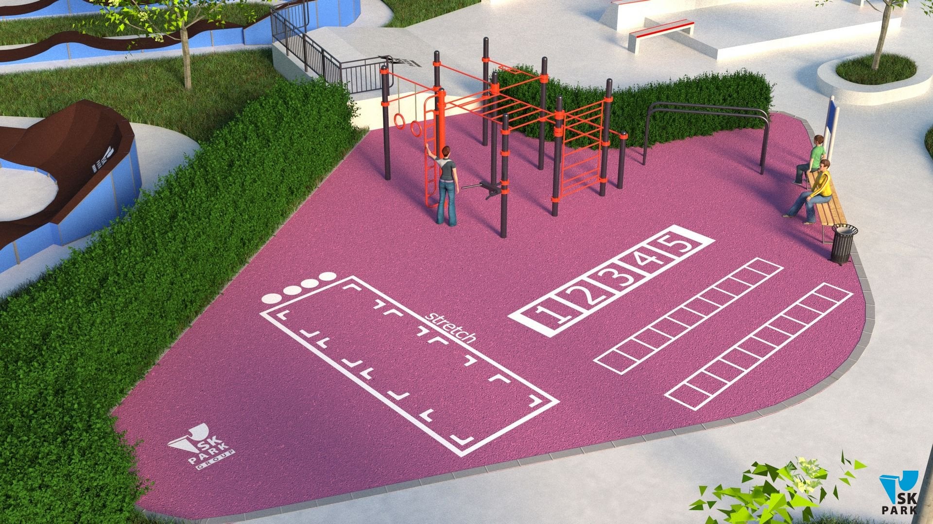 4. Зона воркаут. Включает в себя многофункциональный комплекс для занятий воркаут, зону для растяжки и отдельно стоящие брусья. Общая площадь – 155 кв.м.