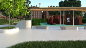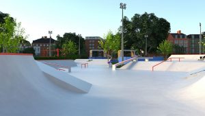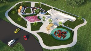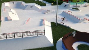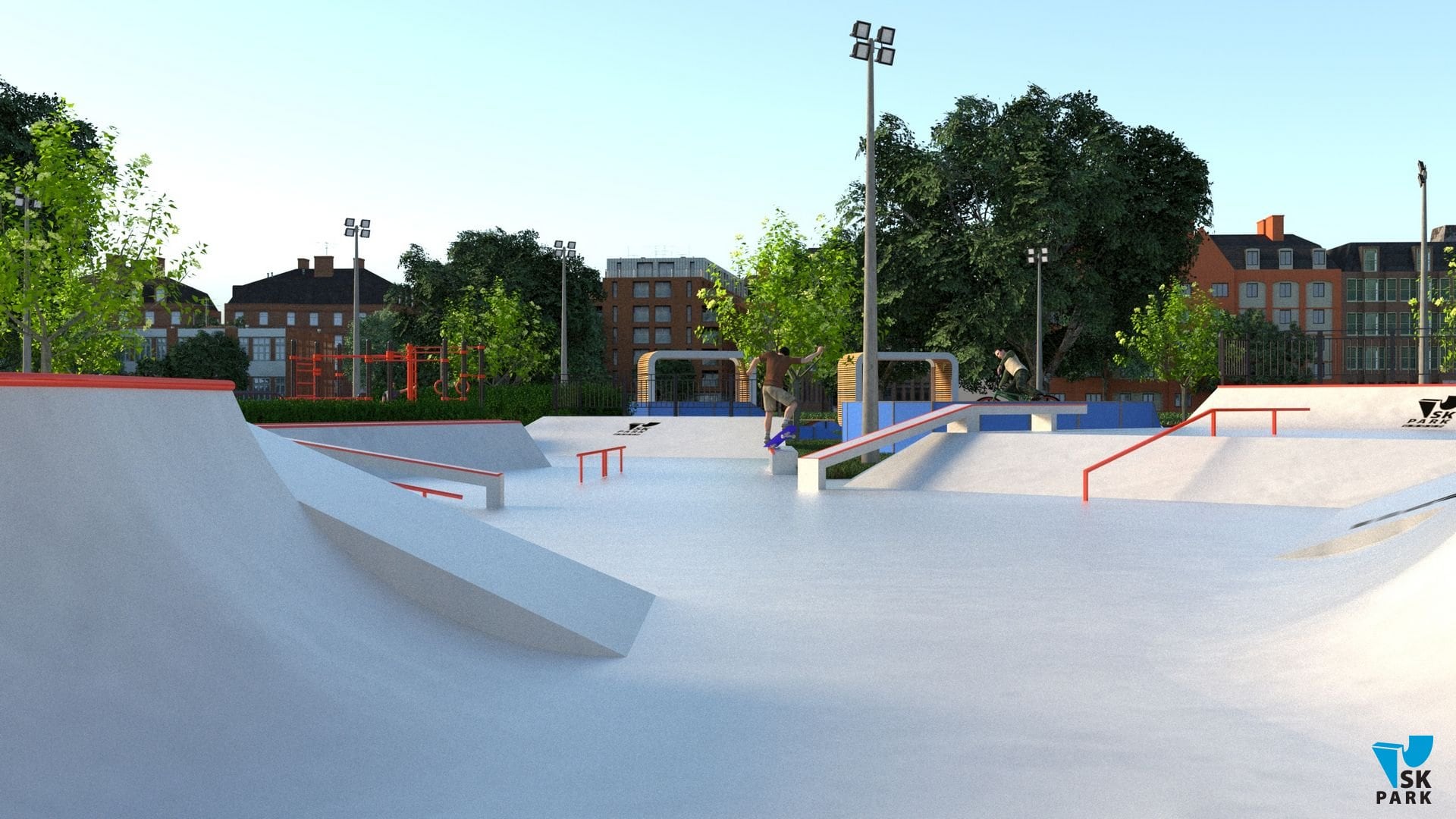 1. Бетонный скейт-парк площадью 860 кв.м. Ориентирован для катания на скейтборде, роликах и кикскуте. Идеально подходит для тренировок в новой олимпийской дисциплине Skateboarding Street. Площадка спроектирована таким образом, что по ней можно кататься по кругу и выполнять трюки без остановки (что очень полезно для профессиональных райдеров во время подготовки к соревнованиям). Большая площадь позволит комфортно кататься одновременно большому количеству человек (до 40), а разнообразие фигур поможет в изучении всех видов трюков.