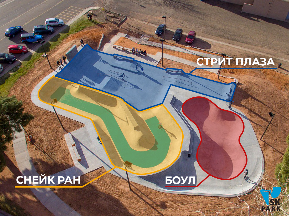 В рамках скейт-плазы, как правило, размещаются следующие фигуры: