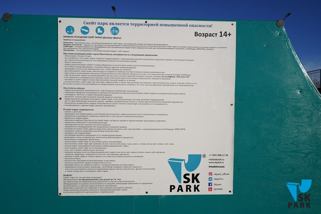 Очень важным моментом является информационная безопасность. Каждый произведенный нами скейт-парк обязательно оборудуется информационным стендом, где размещается договор-оферты с пользователем – правила, которые он принимает, как только приходит на скейт площадку. Одним из основных пунктов этого договора: «Посетитель самостоятельно несет все риски получения травм и летальных исходов». Да, у посетителей есть не только их права, но и обязанности, которые они должны неукоснительно соблюдать, приходя в скейт-парк.