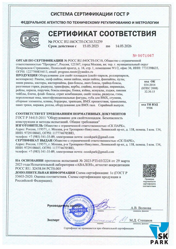 Не стоит переживать. Вся наша продукция изготавливается на нашем собственном производстве на высокоточном оборудовани и является сертифицированной в соответствии с ГОСТ 54415-2011 “Оборудование для скейтплощадок”.