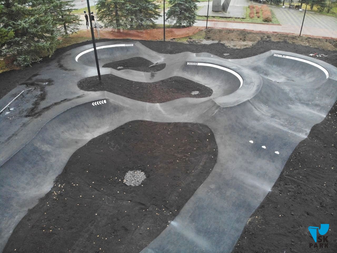 На площадке 600 кв.м. уложена трасса памп-трека, ее протяженность составляет 93 метра, а в целях безопасности оборудован удобные заезд/съезд. Памп-трек подходит для катания и проведения соревнований во всех дисциплинах — кик-скутер, ролики, скейтбординг, bmx/mtb.
