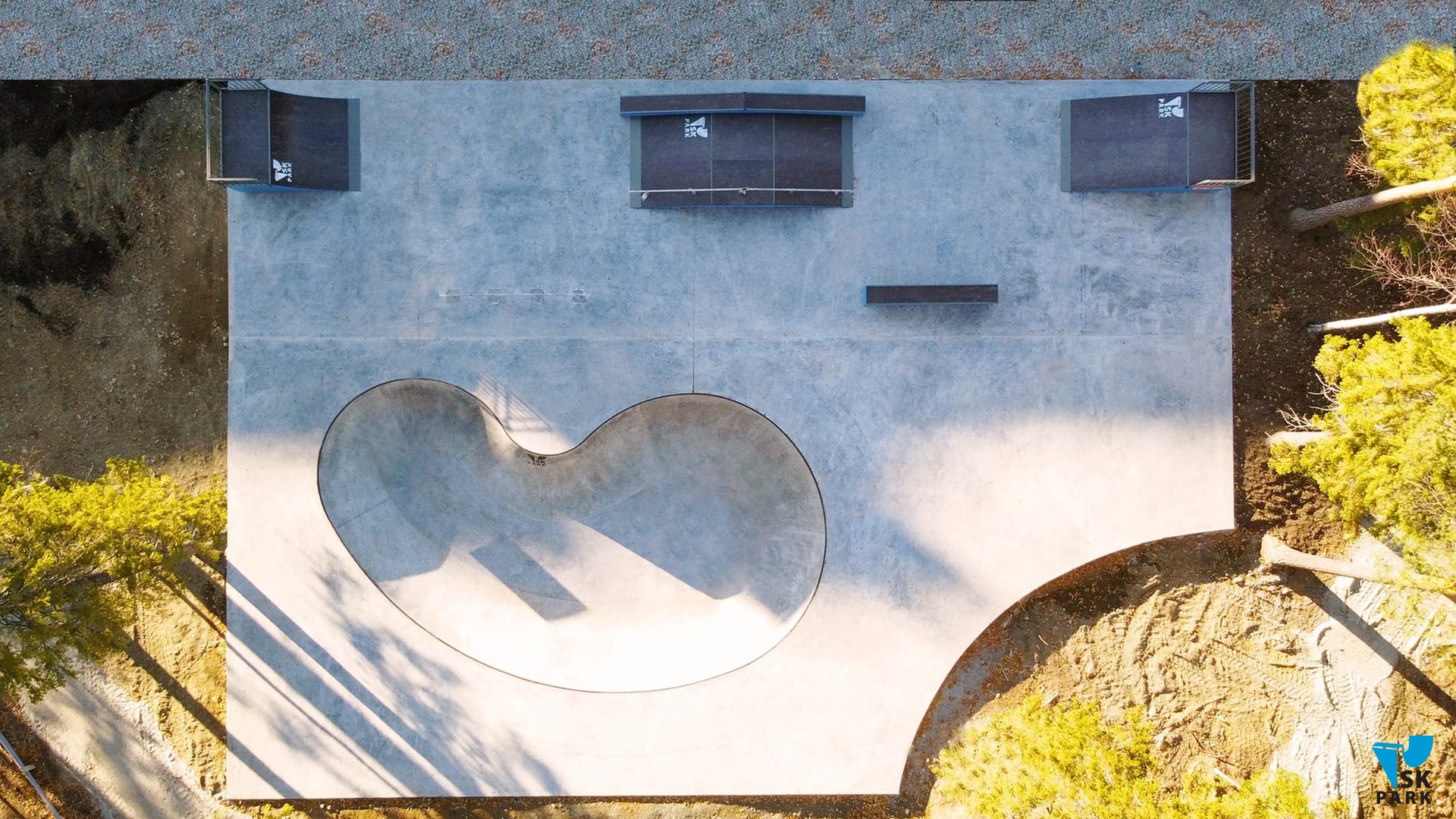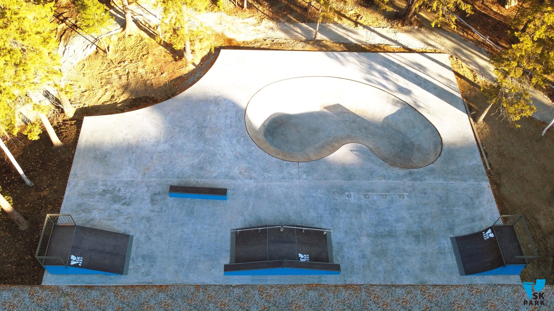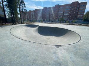В качестве основы скейт парка на площади 300 кв.м. была залита армированная бетонная плита толщиной 150 мм., поверх который мы установили каркасные фигуры — квотерпайп, бэнк, фанбокс с перилами и боксом, а также прямой бокс и флэт-перилу для тренировок прыжков и скольжений начинающими райдерами. В отдельной зоне мы построили бетонный боул — это изюминка нового скейт парка в Новоуральске. Бетонный боул общей площадью 167 кв.м. сам по себе является полноценным скейт парком — в нем предусмотрены хип для прыжков и 2 чаши. Архитектура боула позволяет оттачивать мастерство не только рядовым райдерам, но и спортсменам Олимпийской дисциплины Скейтбординг «Парк». Умение набирать скорость и не сбавлять её во время проезда без дополнительных отталкиваний и выполнять «трансферные» прыжки из одной плоскости в другую — это навыки без которых не обойтись, не говоря о таких базовых элементах как развороты, съезды и заезды в радиус – все эти умения можно освоить благодаря катанию в боуле.