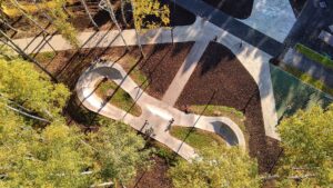 Точками старта для катания могут служить как входная группа, так и широкий стол в центре памп трека, с которого предусмотрен плавный съезд.