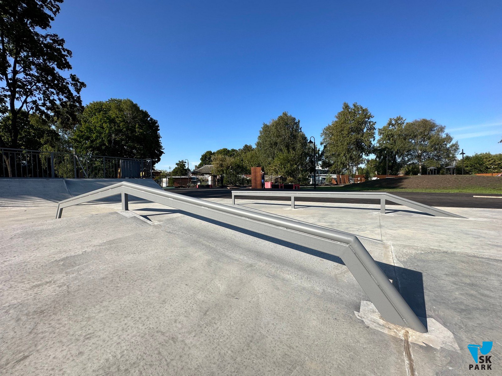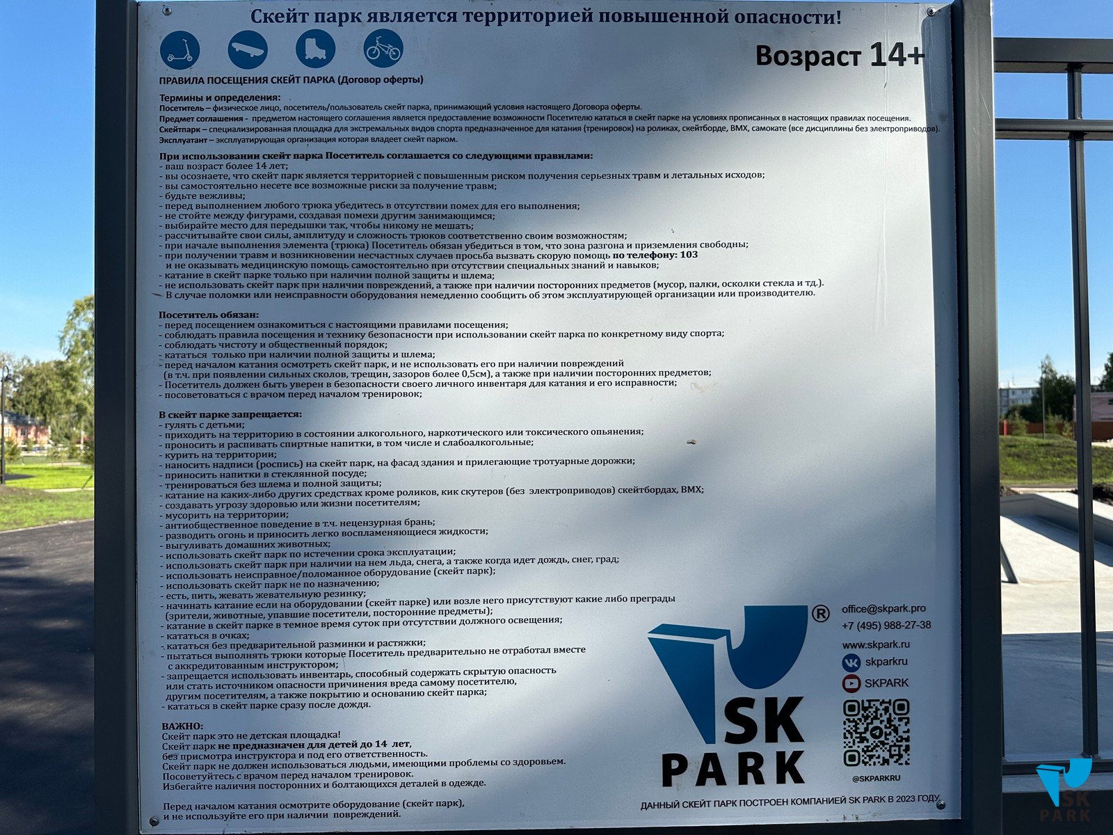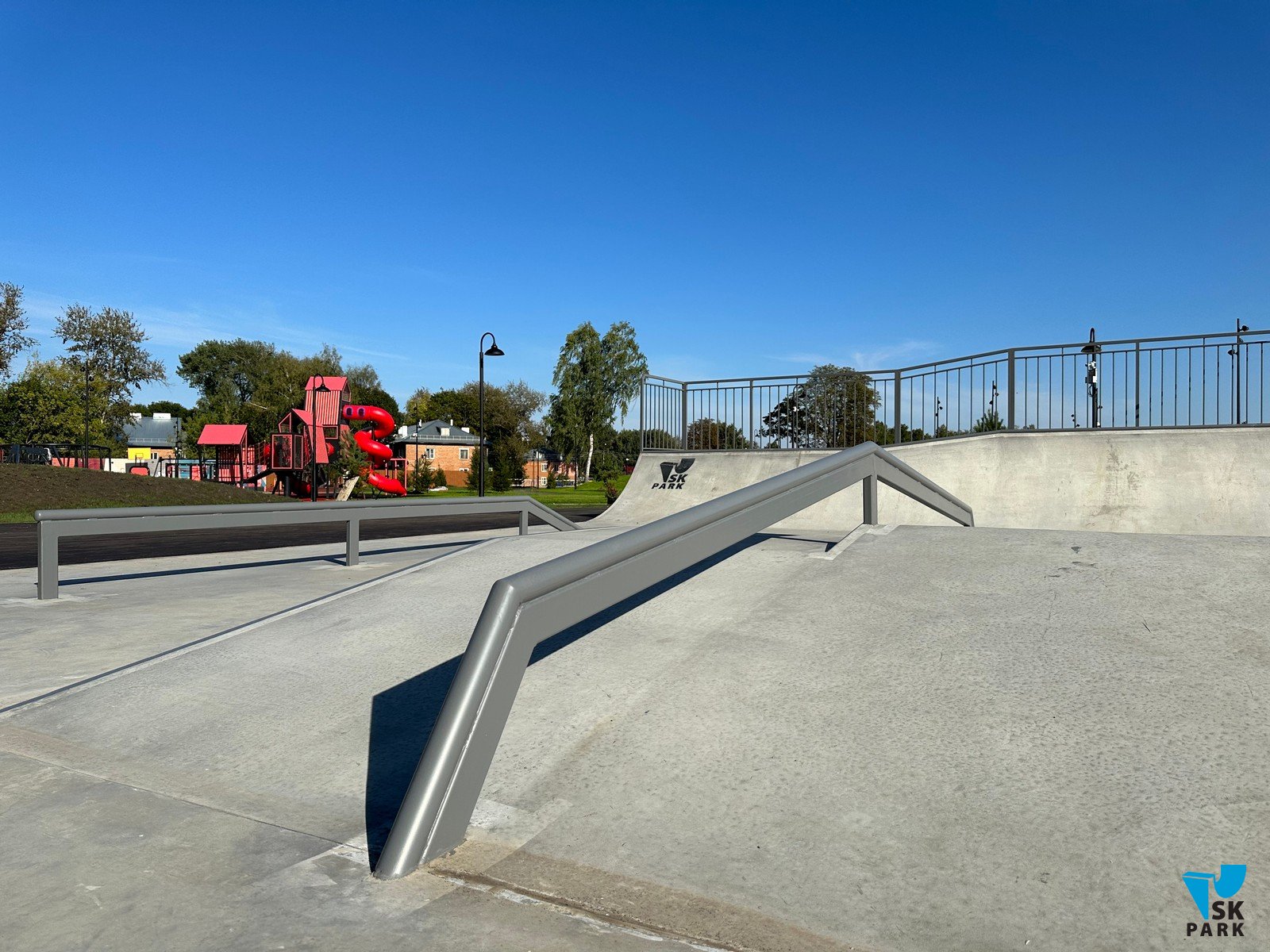 Скейт парк площадью 186 кв.м. отлично подходит для тренировки различных прыжков и скольжений. Для набора скорости проектом предусмотрены квотерпайпы и бэнк различной высоты и конфигурации. В центре площадки установлена длинная перила и фанбокс с наклонной гранью и перилой. Геометрия и размеры площадки рассчитаны таким образом, чтобы катание было максимально эффективным и безопасным для райдеров начального и среднего уровня катания. Новый скейт парк в Киреевске подходит для разового посещения и организации учебно-тренировочного процесса.