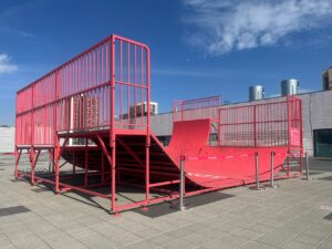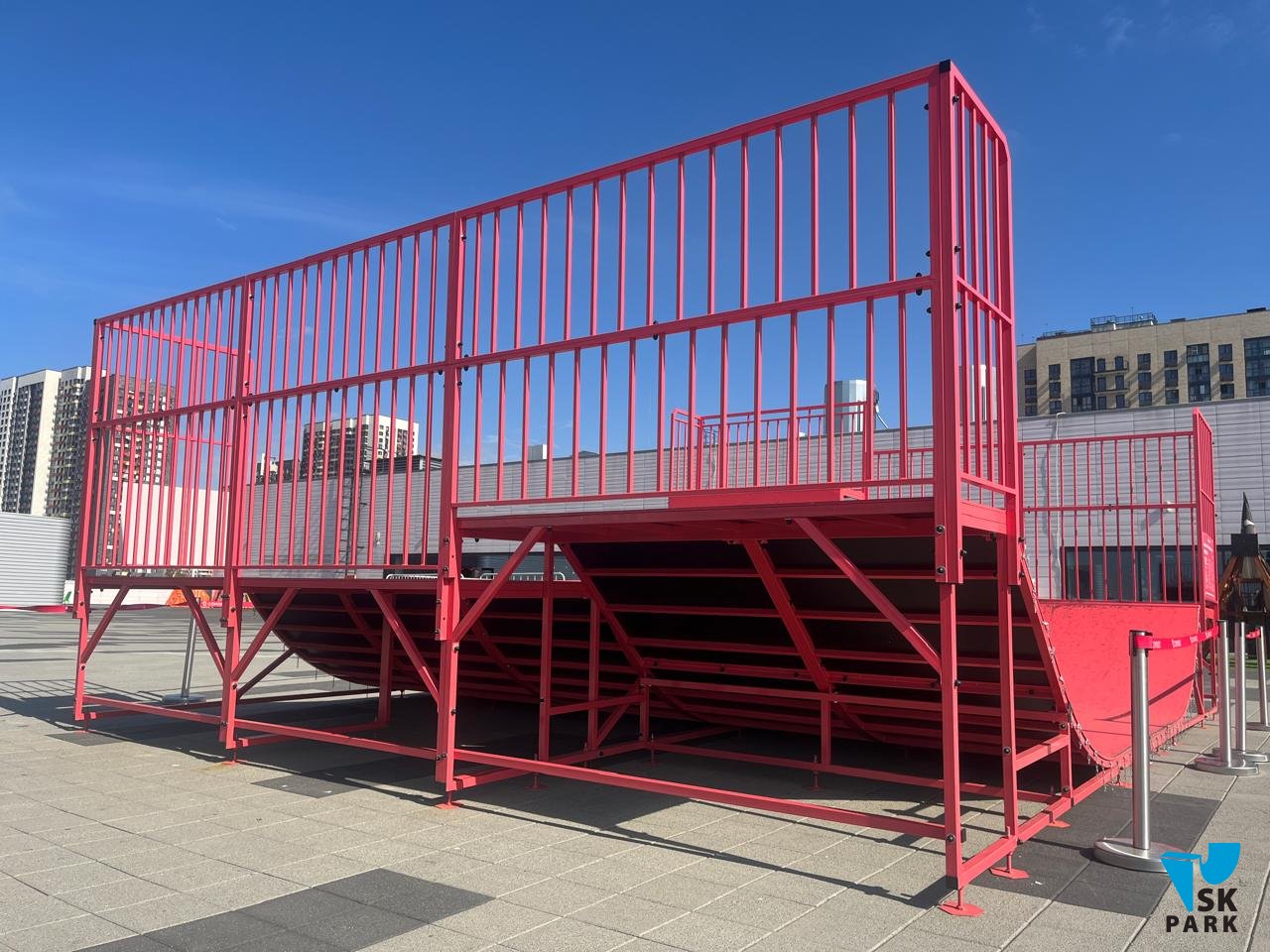 Скейт-парк изготовлен на металлическом каркасе, рабочая поверхность обшита ламинированной ФСФ фанерой с нанесенным сетчатым рифлением, что улучшает сцепление колес с покрытием и качество катания. Преимуществом скейт-парков на металлическом каркасе является долгий срок эксплуатации, а также возможность сезонного демонтажа и повторного сборки, в случае необходимости.