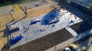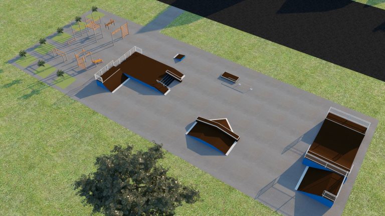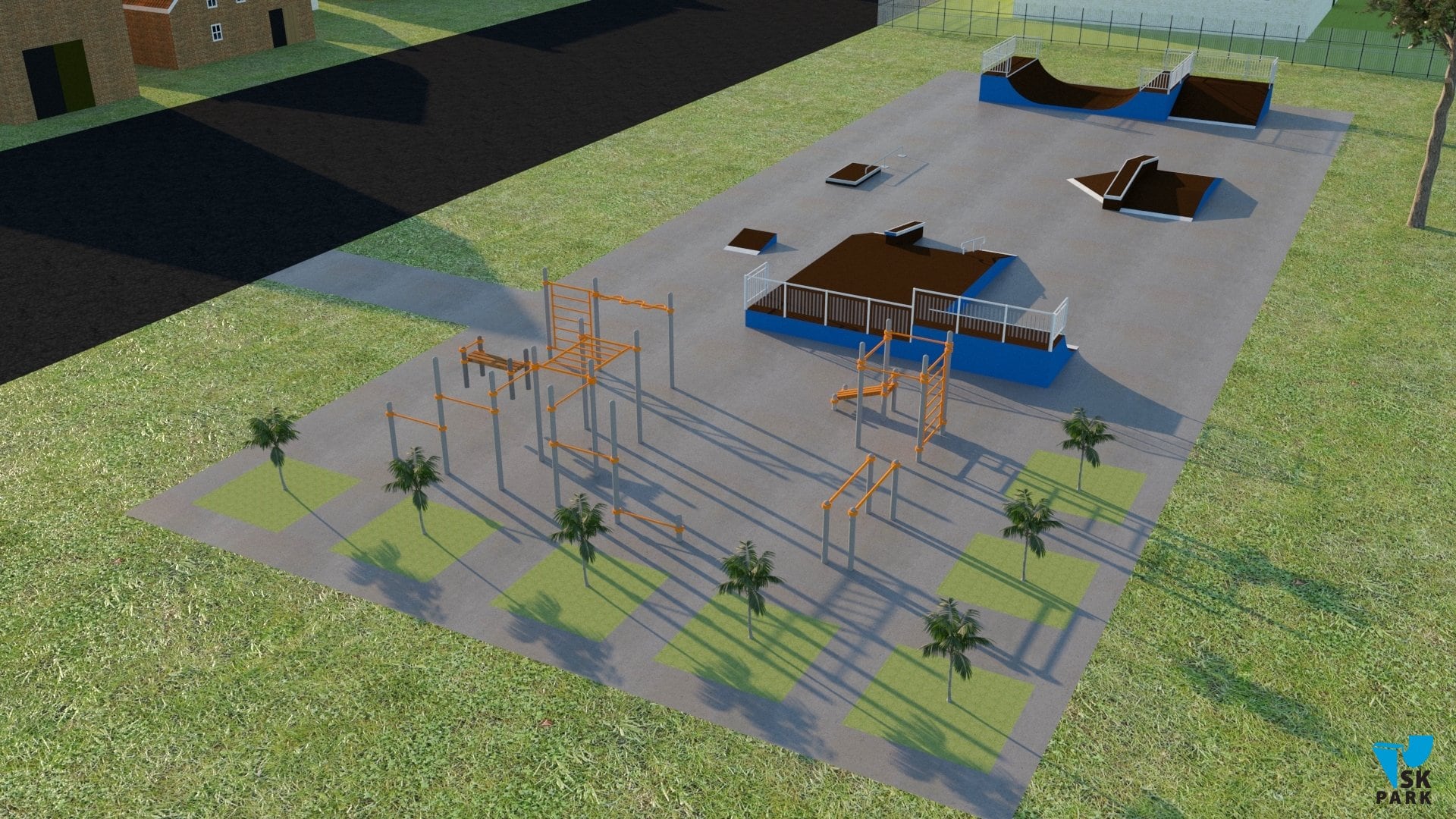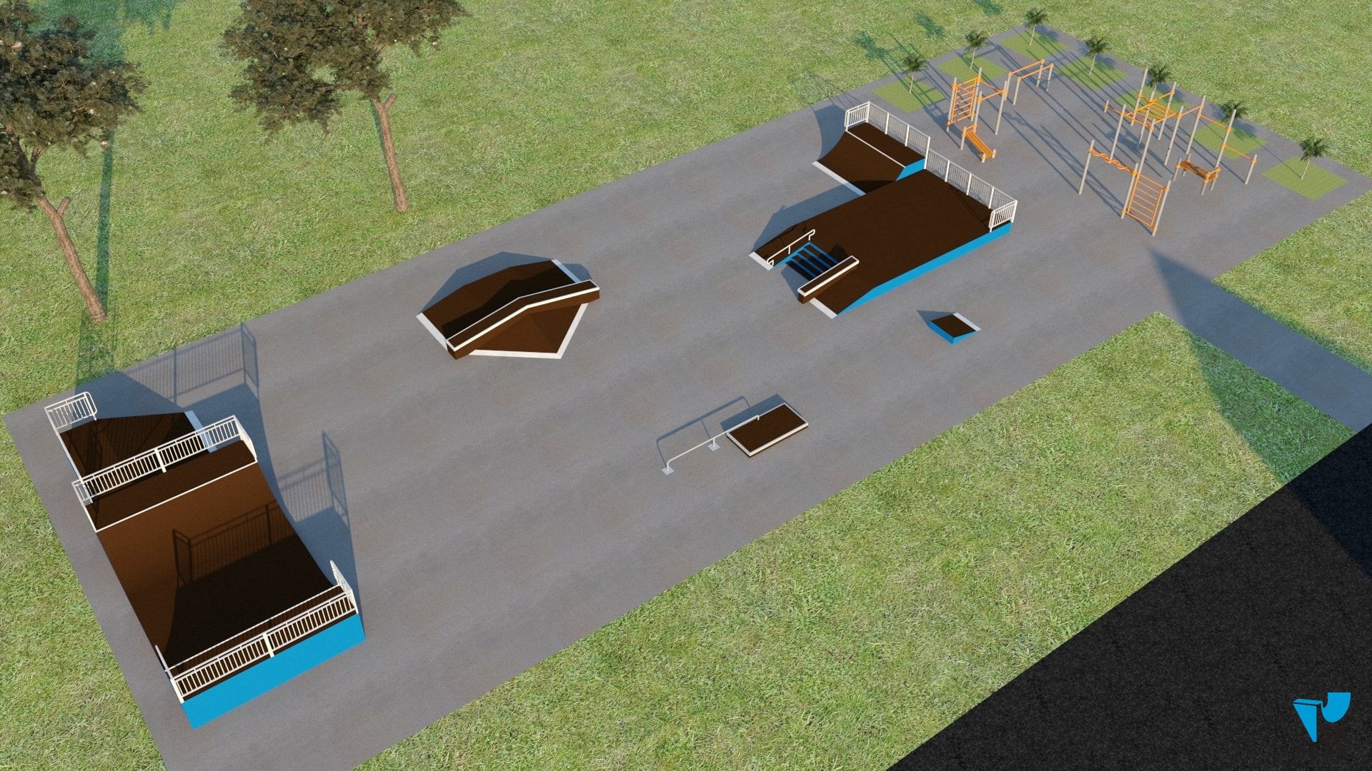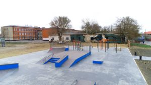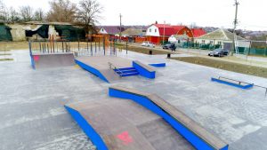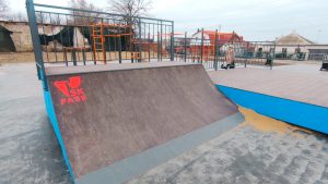 Cкейт парк - за основу был взят один из типовых проектов от компании SK PARK. На площади 545 кв.м установлены фанбокс, скейт плаза, квотерпайп и мини-рампа М2 шириной почти 5 метров, а так же линия фигур для изучения базовых трюков по прыжкам и скольжениям. Площадка рассчитана на райдеров начального и среднего уровня в таких дисциплинах как скейтбординг, ролики, кик-скутер и вмещает до 15 человек. Фигуры скейт парка собраны на деревянном каркасе, предварительно обработанном огне- био- защитным и антикоррозийным составом. Рабочая поверхность обшита ламинированной фанерой с антискользящим покрытием, крепежные элементы оцинкованы и устойчивы к воздействию окружающей среды.