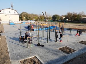 Воркаут-зона так же была разработана по индивидуальному проекту, на базе одного из типовых решений, площадка занимает 280 кв.м. и состоит из нескольких секций - рукоход, турник-квадрат, перекладина и шведская лестница, секция из трех перекладин разноуровневая, скамья для пресса, брусья крестовые овальные, брусья низкие и брусья американские.