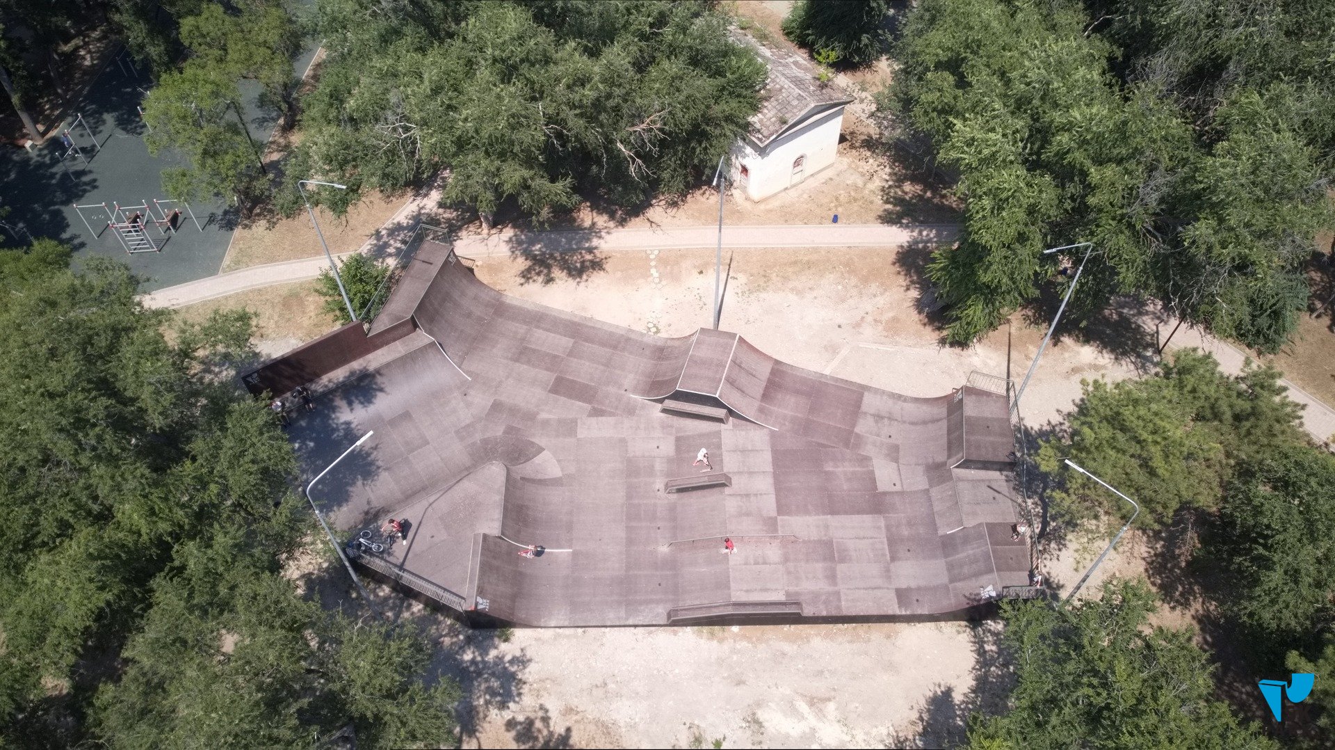 Проект скейт парка в Феодосии был реализован "под ключ" компанией SKpark, начиная с разработки проекта, вплоть до введения площадки в эксплуатацию, включая производство и поставку всего оборудования. Скейт плаза собрана на деревянном каркасе, который размещен на бетонном, свайном фундаменте — это не типичное решение для подобных проектов, позволяющее избежать последствий от выпадающих дождя и снега и значительно продлить срок эксплуатации площадки в целом. Каркас собран из гладкостроганой доски, торцы зашиты влагостойкой фанерой, рабочая поверхность обшита ламинированной фанерой с нанесенным рифлением, что позволяет улучшить сцепление колес с покрытием, ограждения сделаны из стальной трубы марки СТ3. Все металлические элементы окрашиваются порошковым составом, при сборке используется оцинкованный крепёж. Все оборудование скейт парка изготовлено на собственном производстве компании SKpark.