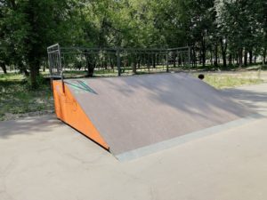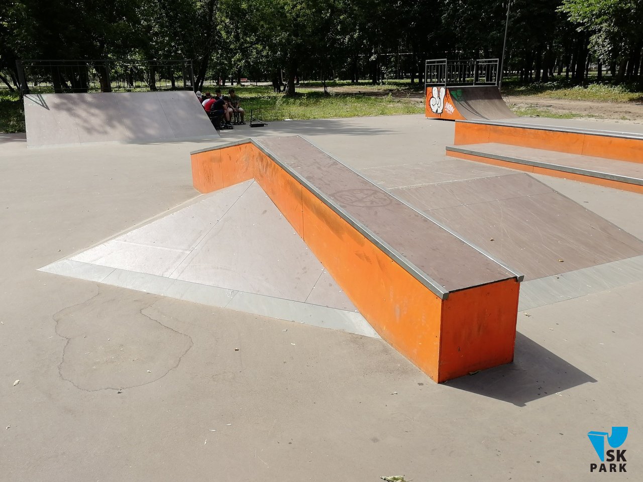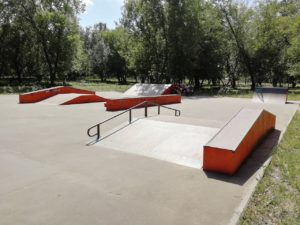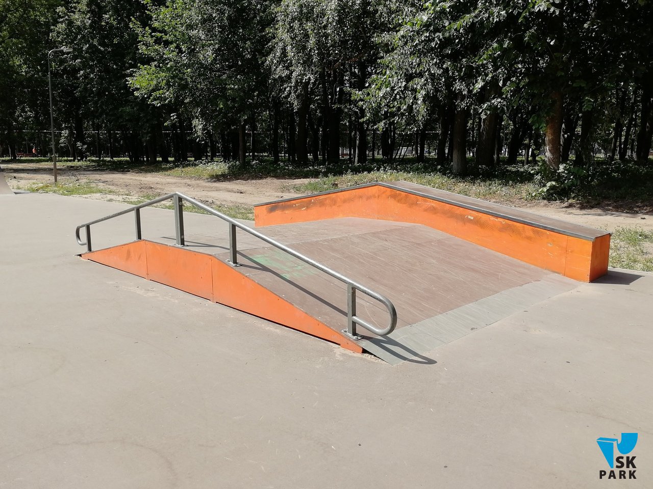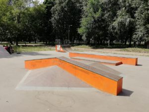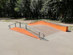 Данный объект создан по индивидуальному проекту и оснащен комплексом фигур, в том числе для освоения и отработки базовых навыков и трюков. По желанию заказчика, торцевые панели фигур были выкрашены в оранжевый цвет.