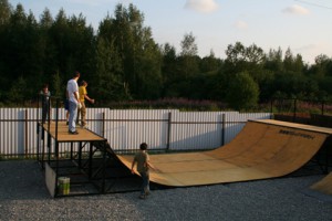 В состав скейтпарка входят: минирампа, разгонная горка, минифанбокс и грайнд-бокс