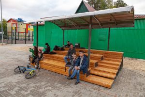 Для зрителей установлена трибуна с навесом, рассчитанная на 30 мест. Трибуна изготовлена из металлического каркаса с использованием труб разного сечения марки СТ3. Элементы каркаса обработаны методом полимерно-порошкового покрытия, рабочие поверхности пола и сидений покрыты деревянным настилом. Навес изготовлен из сотового поликарбоната толщиной - 8мм.